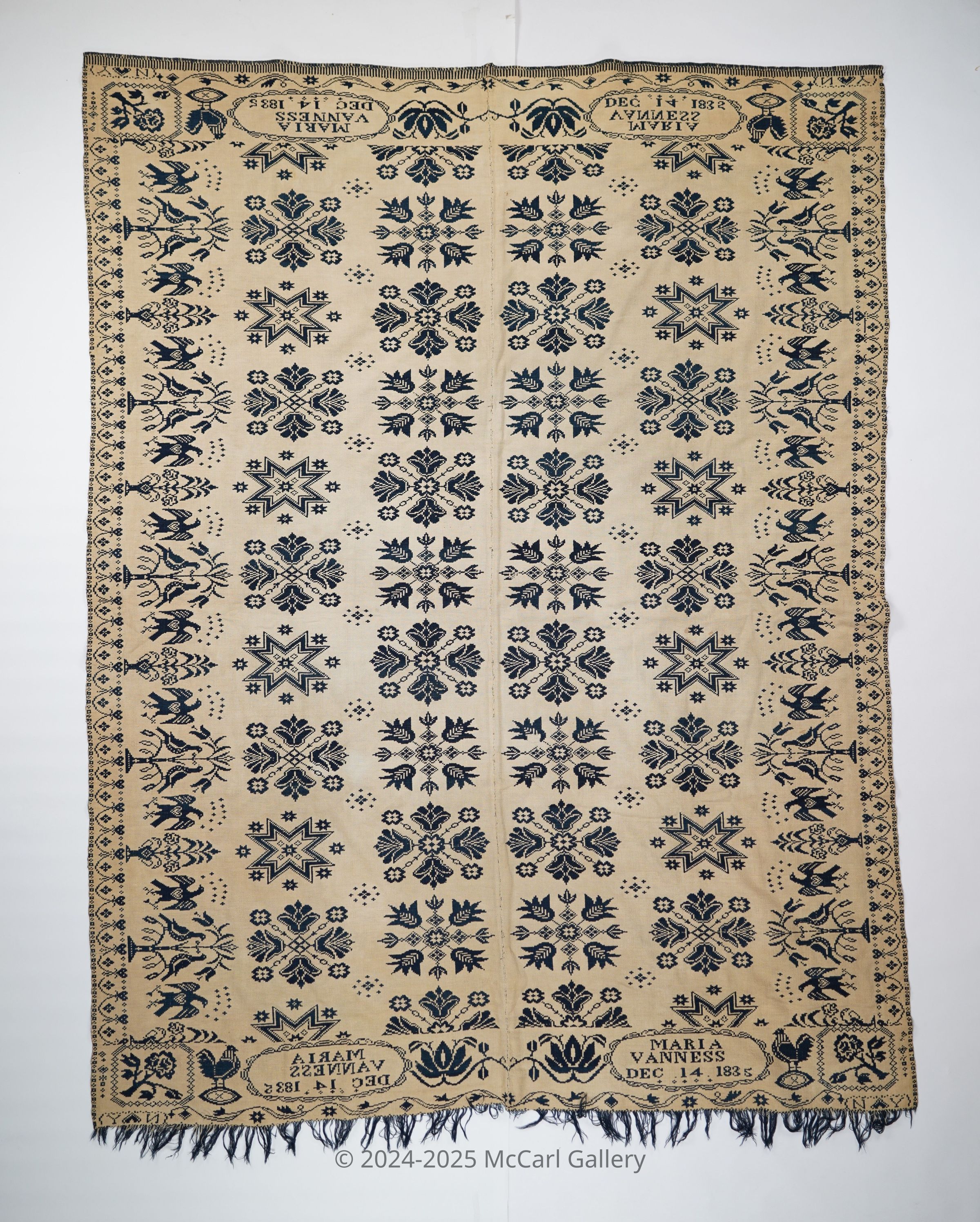 Navy and natural figured double weave coverlet with border on four sides and self-fringe along bottom. Two joined panels. Woven for Maria Vanness around December 14, 1835.Collection