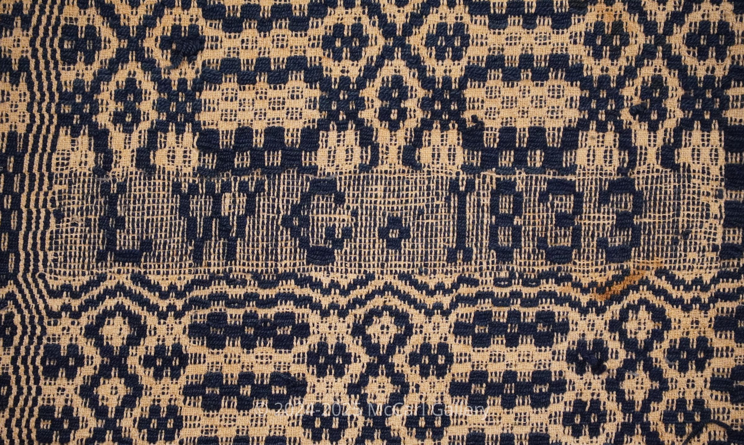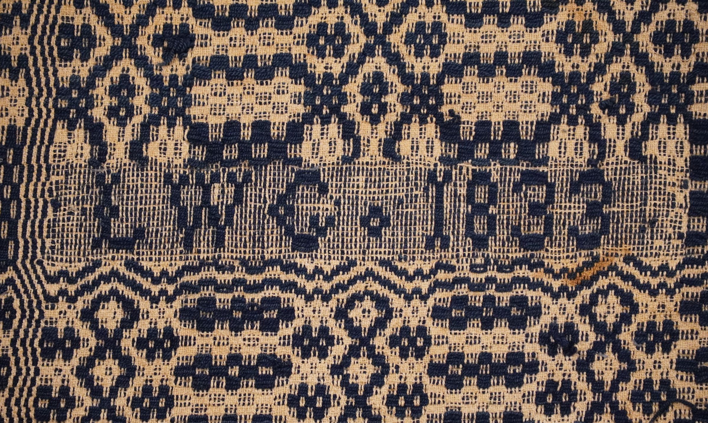 Natural and navy geometric overshot coverlet; two panels joined by a center seam. Border and fringe on three sides.Collection