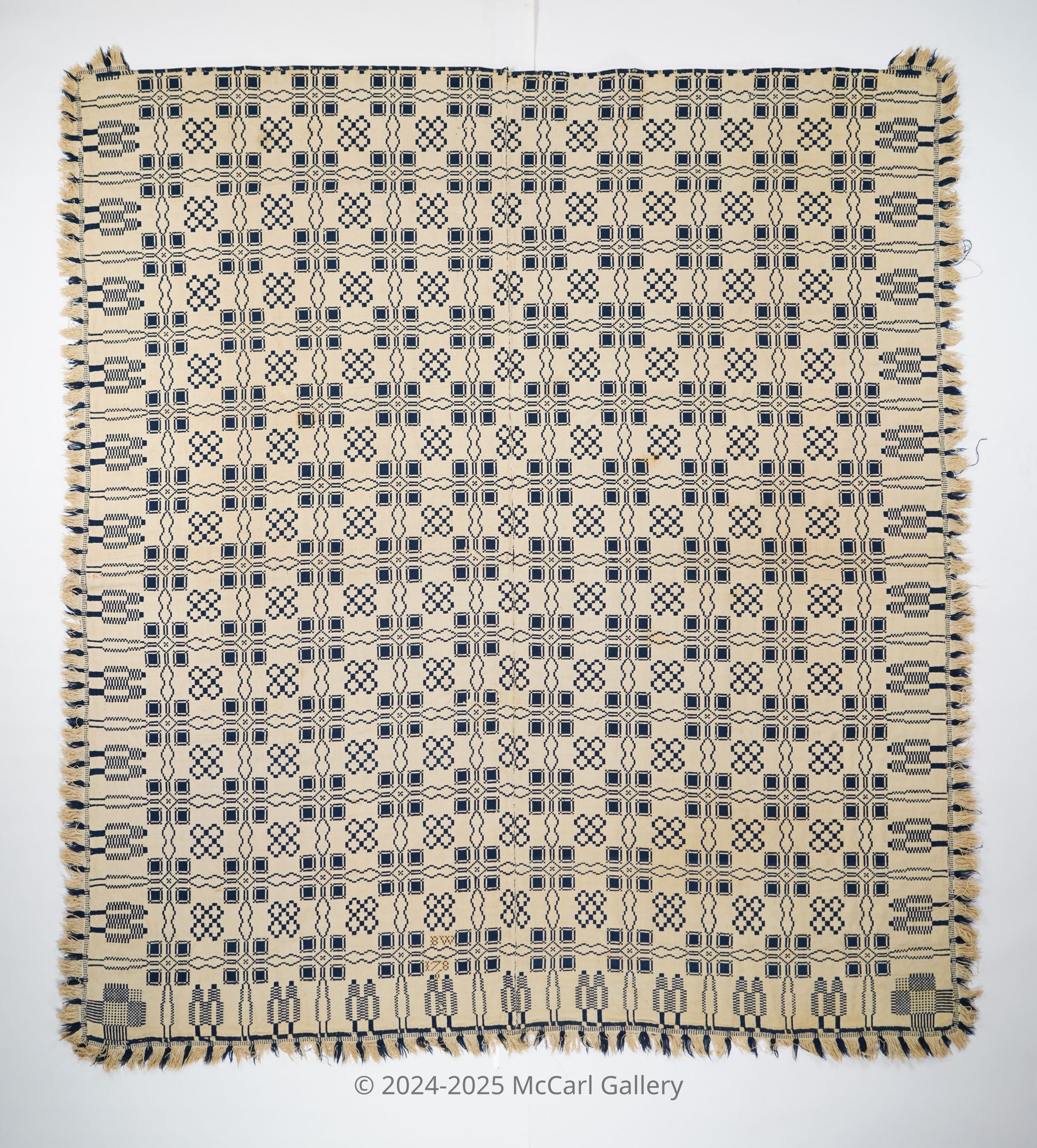 Navy and natural geometric double weave coverlet with border and applied fringe on three sides. The fringe wraps around slightly to the top side. Two joined panels. On the white side of the coverlet "BW / 178 / 6" is cross-stitched near the center seam.Collection