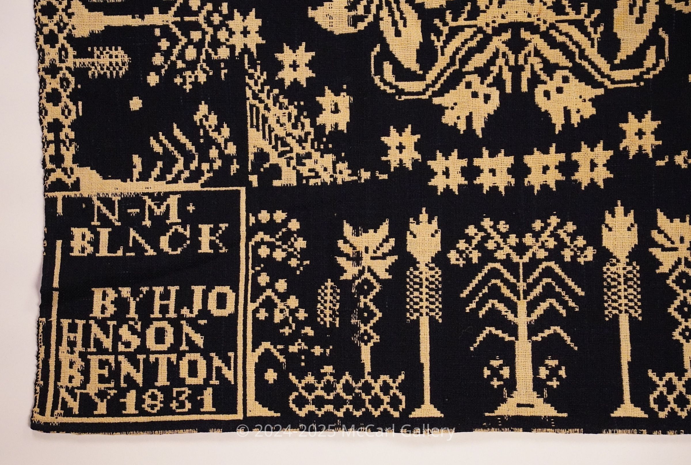 Navy and natural figured double weave coverlet with border on three sides. Two joined panels. Woven for N. M. Black by Henry Johnson in Benton, Yates Co., New York in 1831.Collection