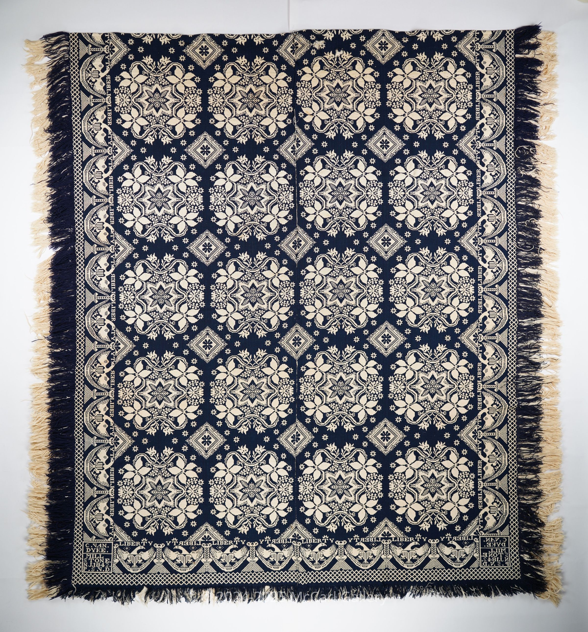 Navy and natural figured doubleweave coverlet with border and fringe around three sides. Woven by Peter Sutphen Van Doren for C. Van Dyke in Millstone, New Jersey in 1842.Collection