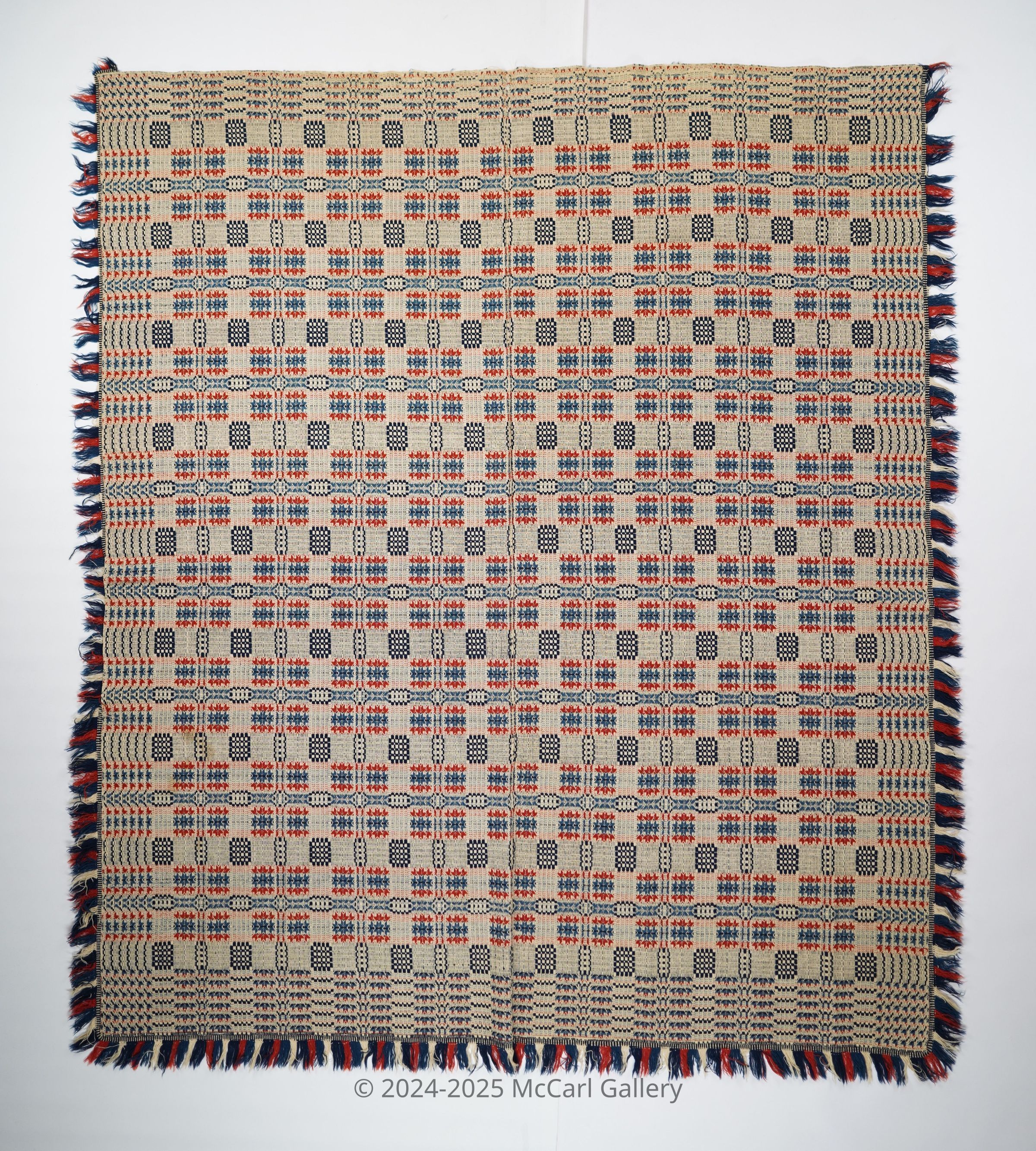 Red, blue, navy and natural geometric coverlet with border on four sides and applied fringe on three sides. Two joined panels.Collection
