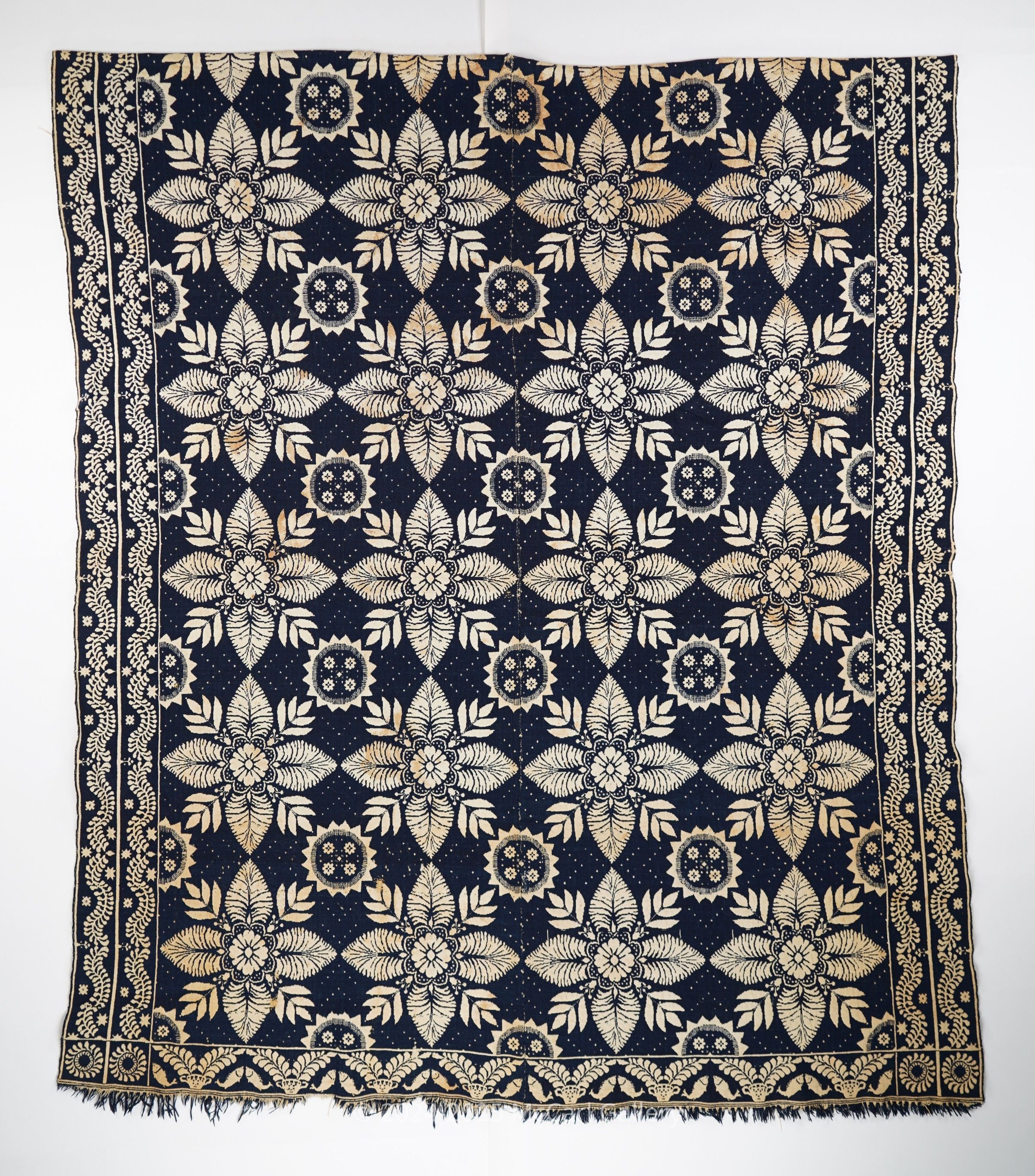 Navy and natural figured doubleweave coverlet with double border on two sides and single border on bottom. Attributed to H. Selzer in Hillsborough, Ohio in c.1859Collection