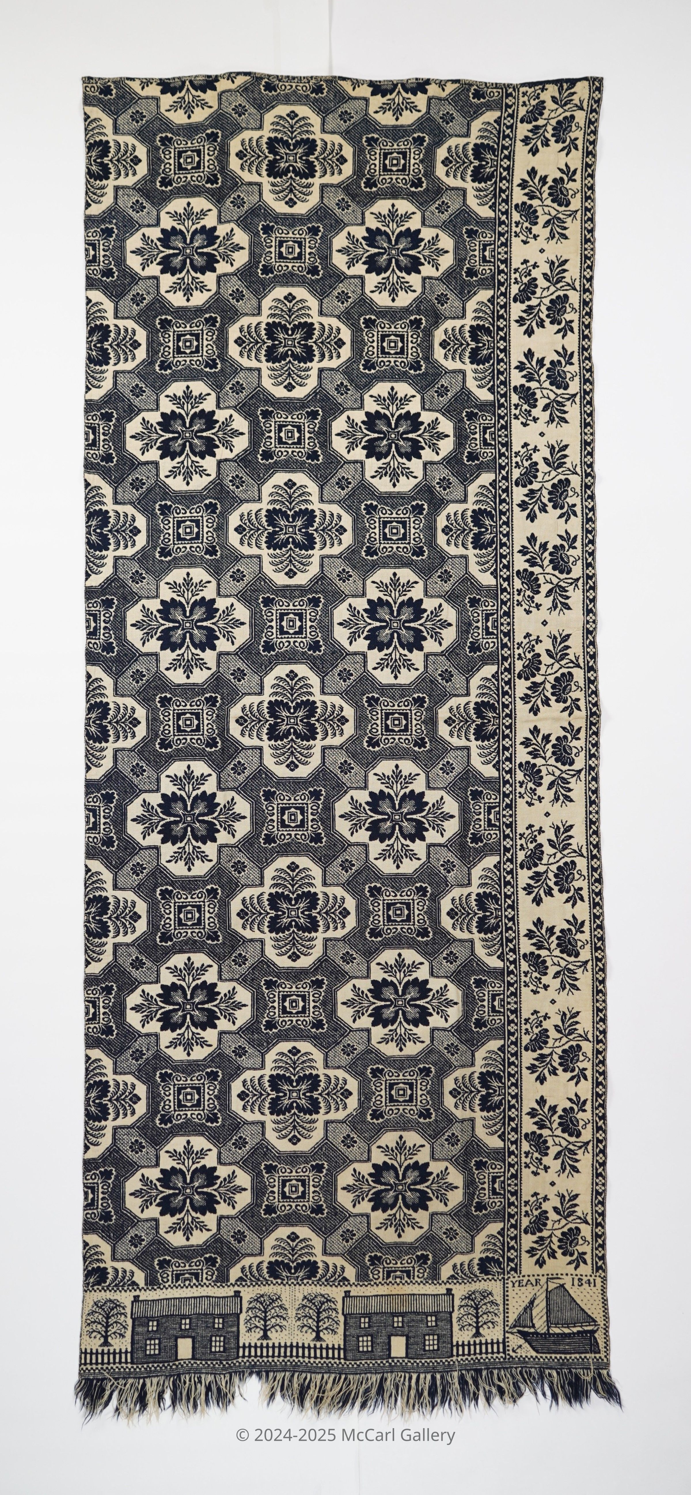 Navy and natural figured double weave coverlet with border on two sides and self-fringe along bottom. One panel. Woven in 1841 by the William or Joseph Gilmour, based on the "Year"/sailboat trademark.Collection