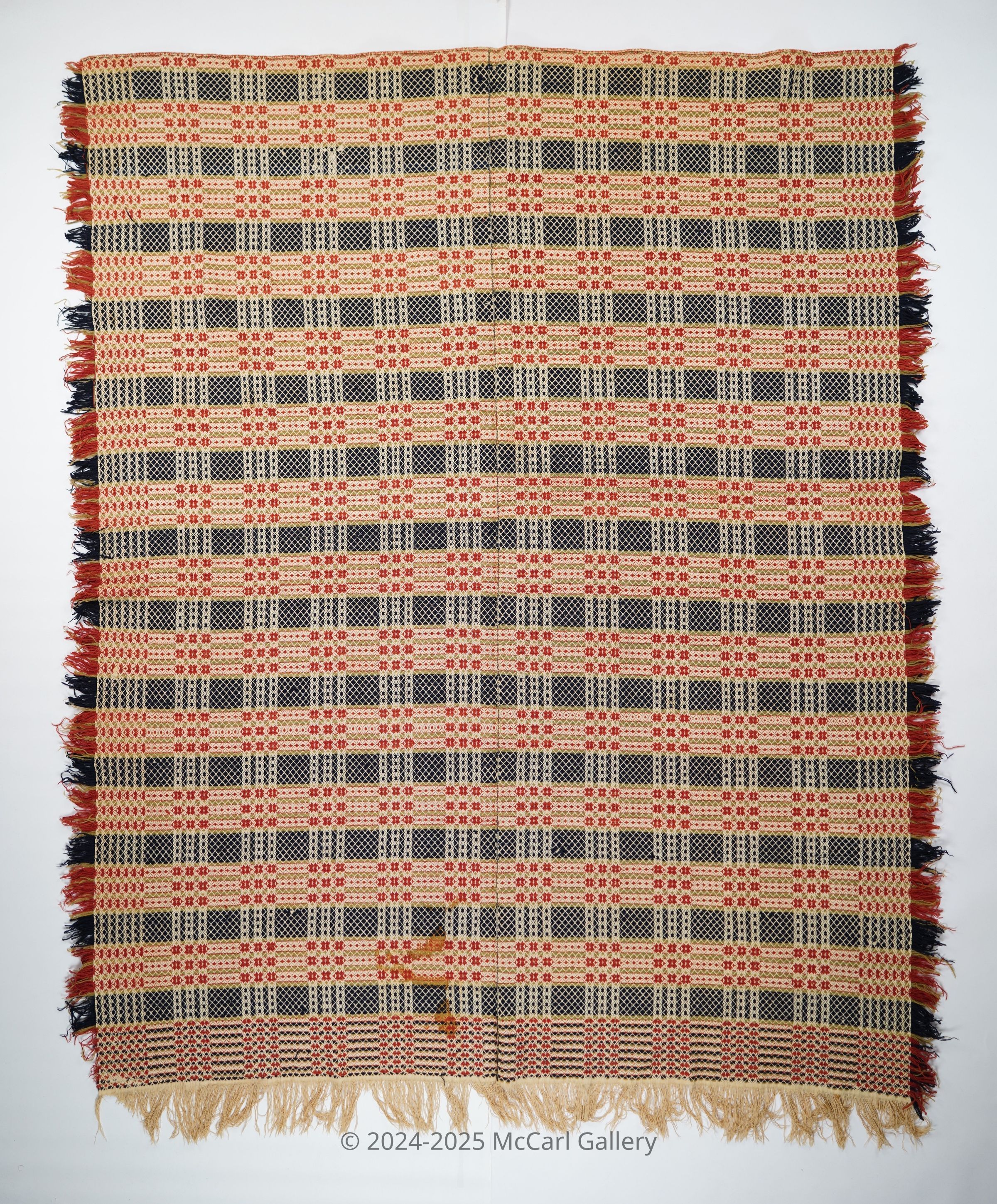 Red, green, navy, and natural geometric point twill coverlet with border and self-fringe on three sides. Two joined panels.Collection