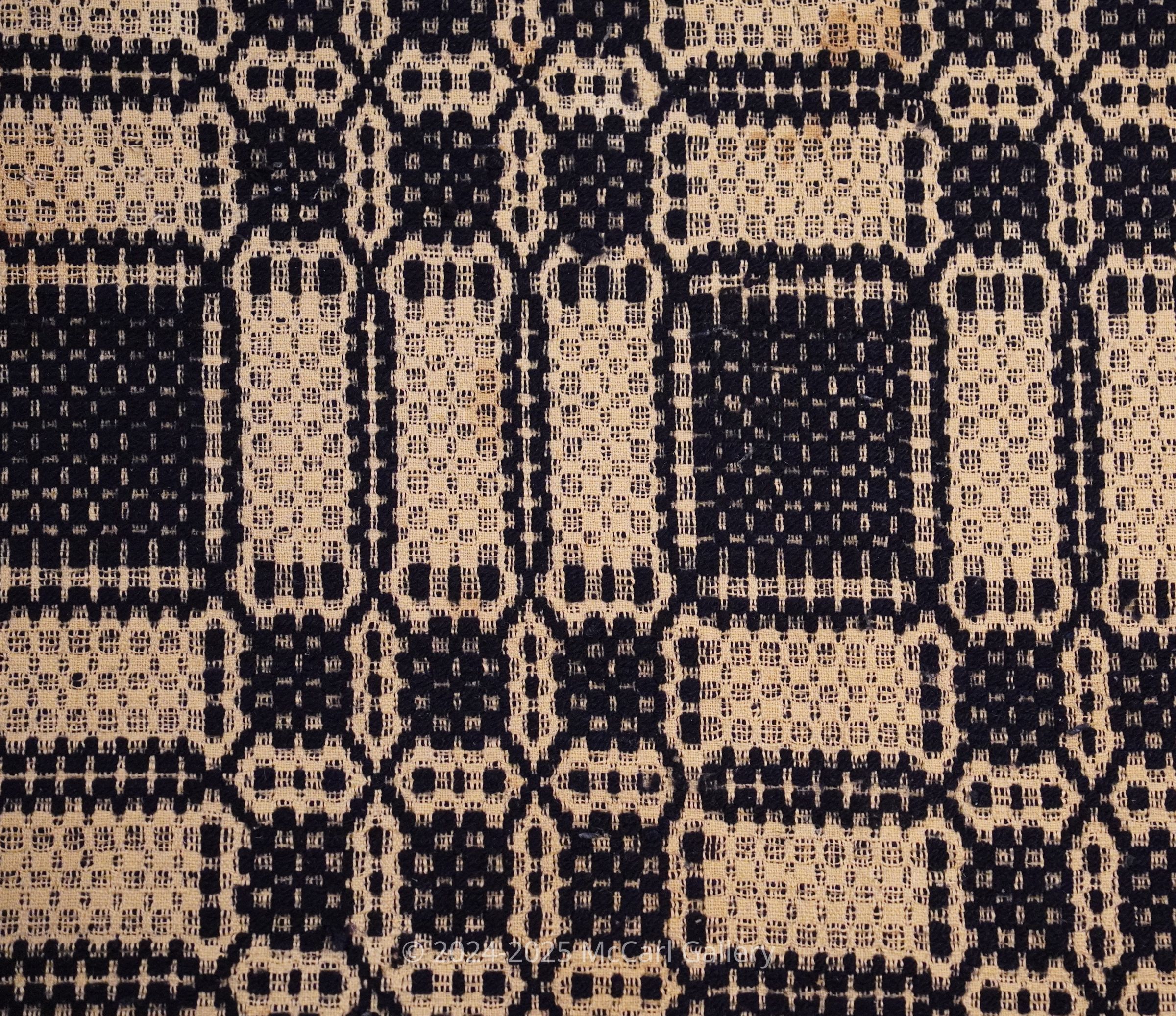 Natural and navy geometric overshot coverlet; two panels joined by a center seam. Border on four sides; no fringe.Collection