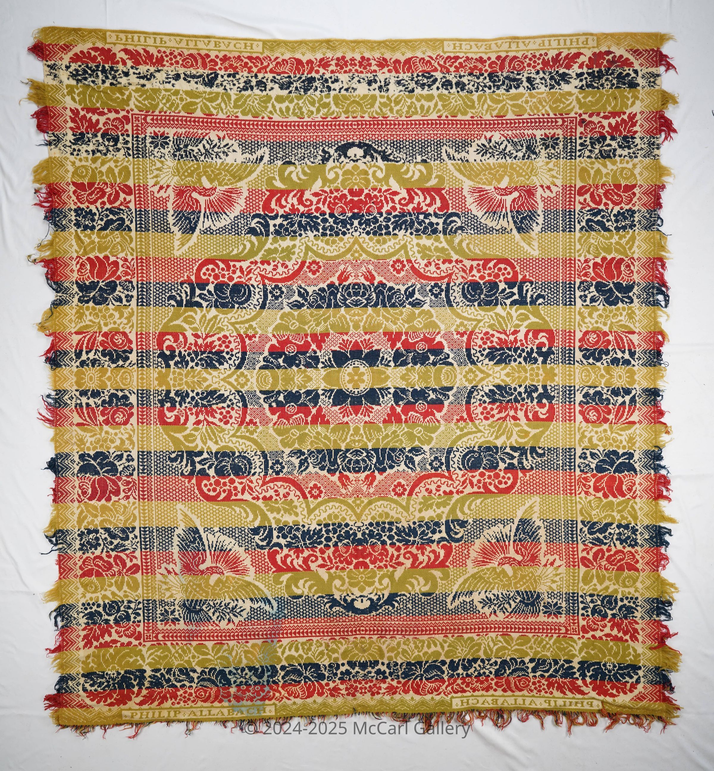 Natural, green, red, and navy figured Tied Beiderwand 4:1 coverlet; seamless. Fringe on three sides, border on four sides.Collection