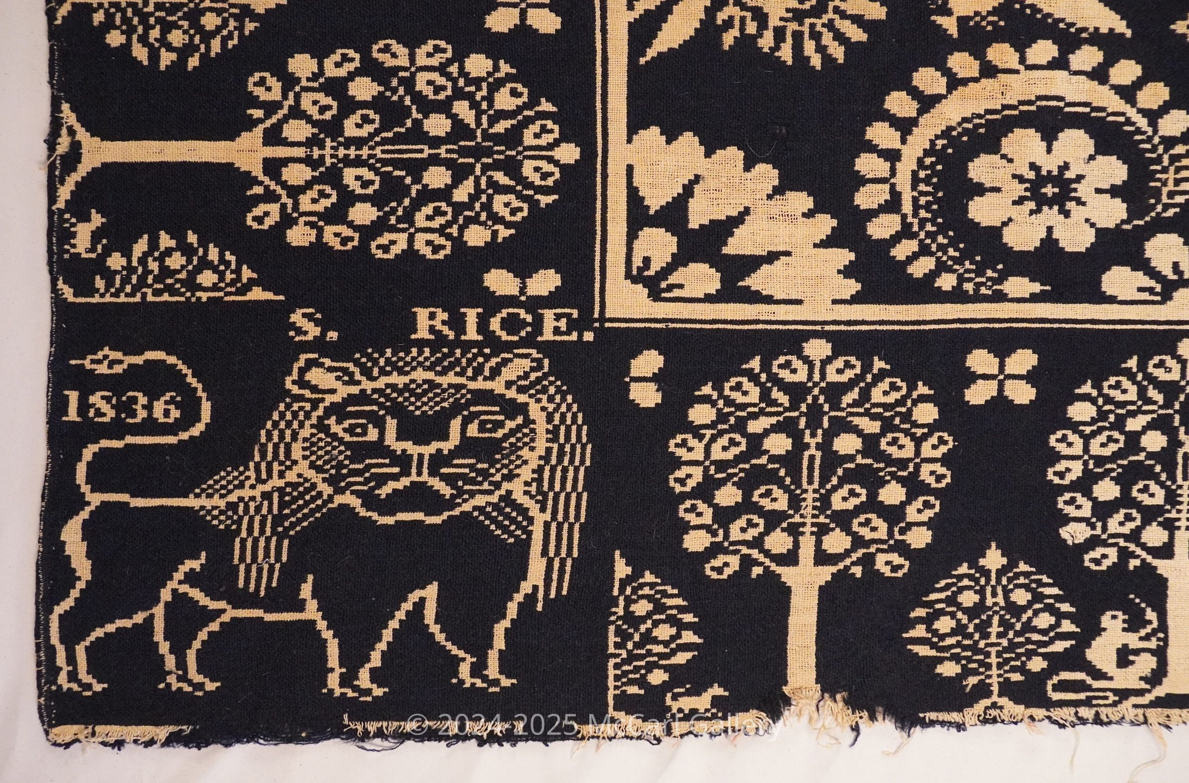 Natural and navy figured double weave coverlet; two panels joined by a center seam. Border on three sides.Collection
