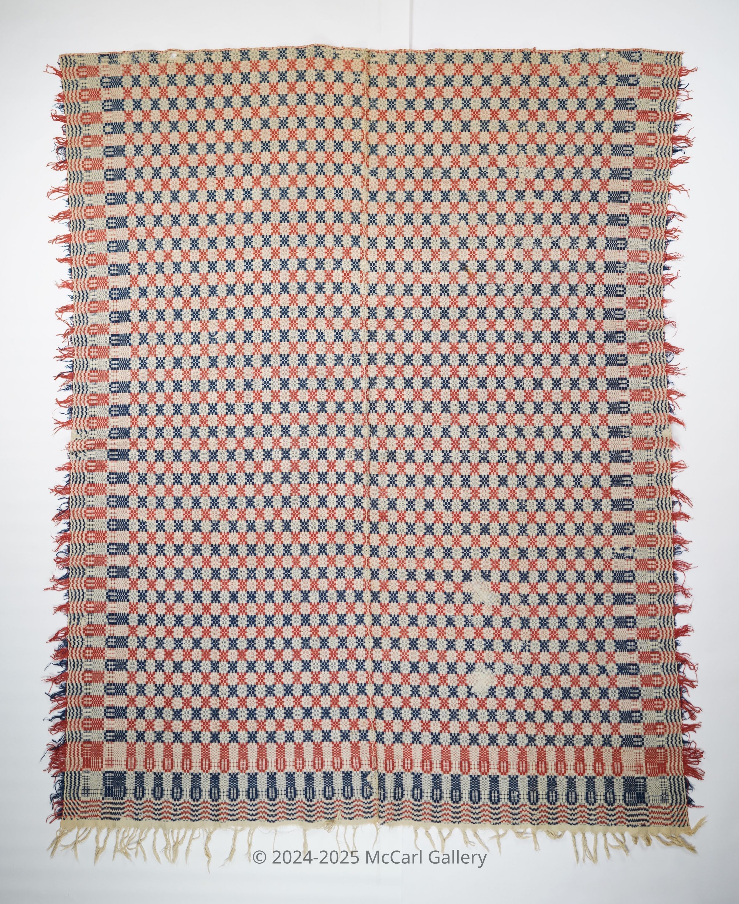 Red, navy, and natural geometric overshot coverlet with self-fringe and border on three sides. Two joined panels.
