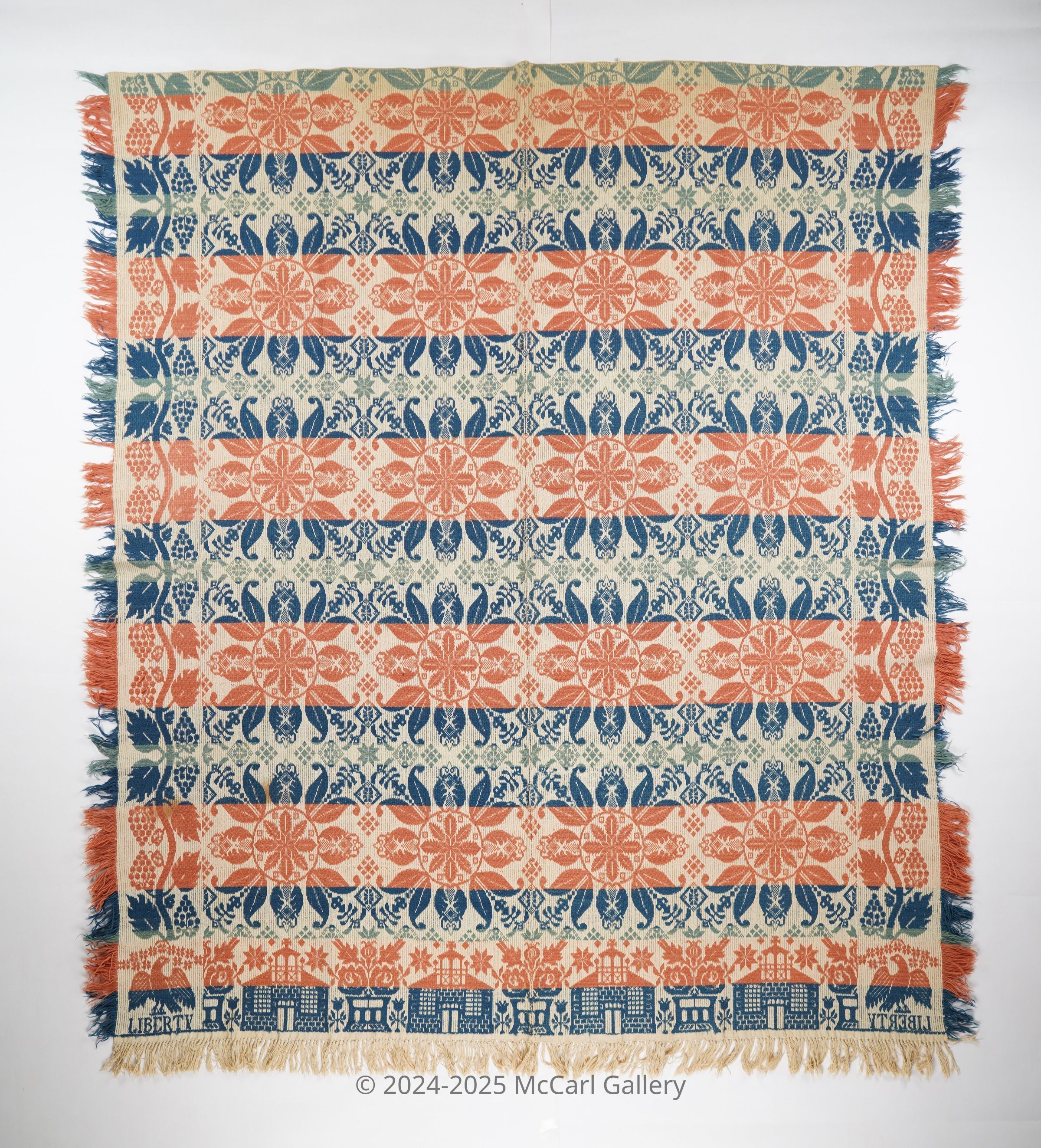 Figured and fancy doubleweave coverlet with borders on 3 sides and self-fringe on both sides and bottom. Two panels joined by a center seam. Navy, light blue, and red wool with undyed cotton. Floral medallions centerfield pattern; grapevine border on sides; Buildings and roses border on bottom. Liberty eagle trademark possibly attributed to F. Peter Bolinger.Collection