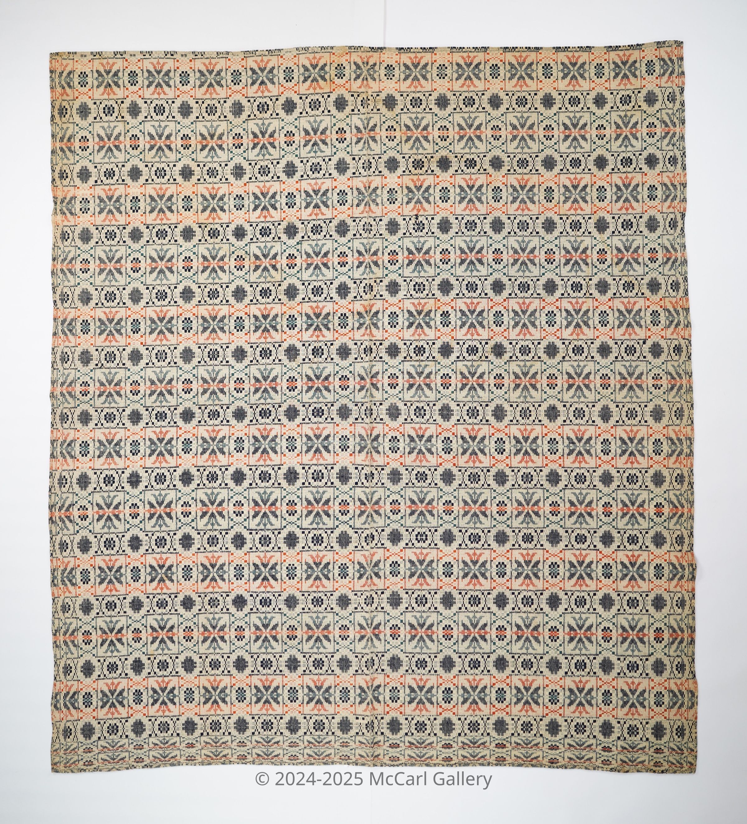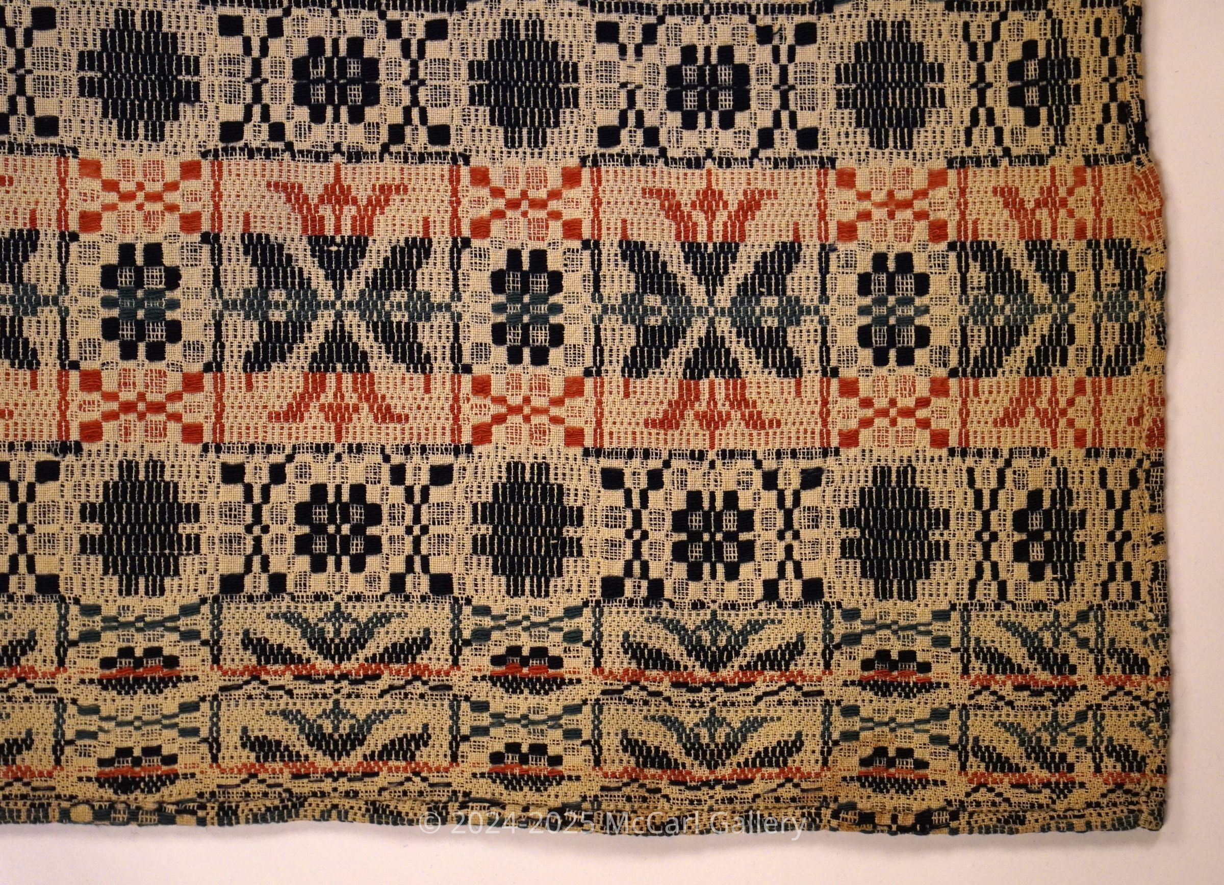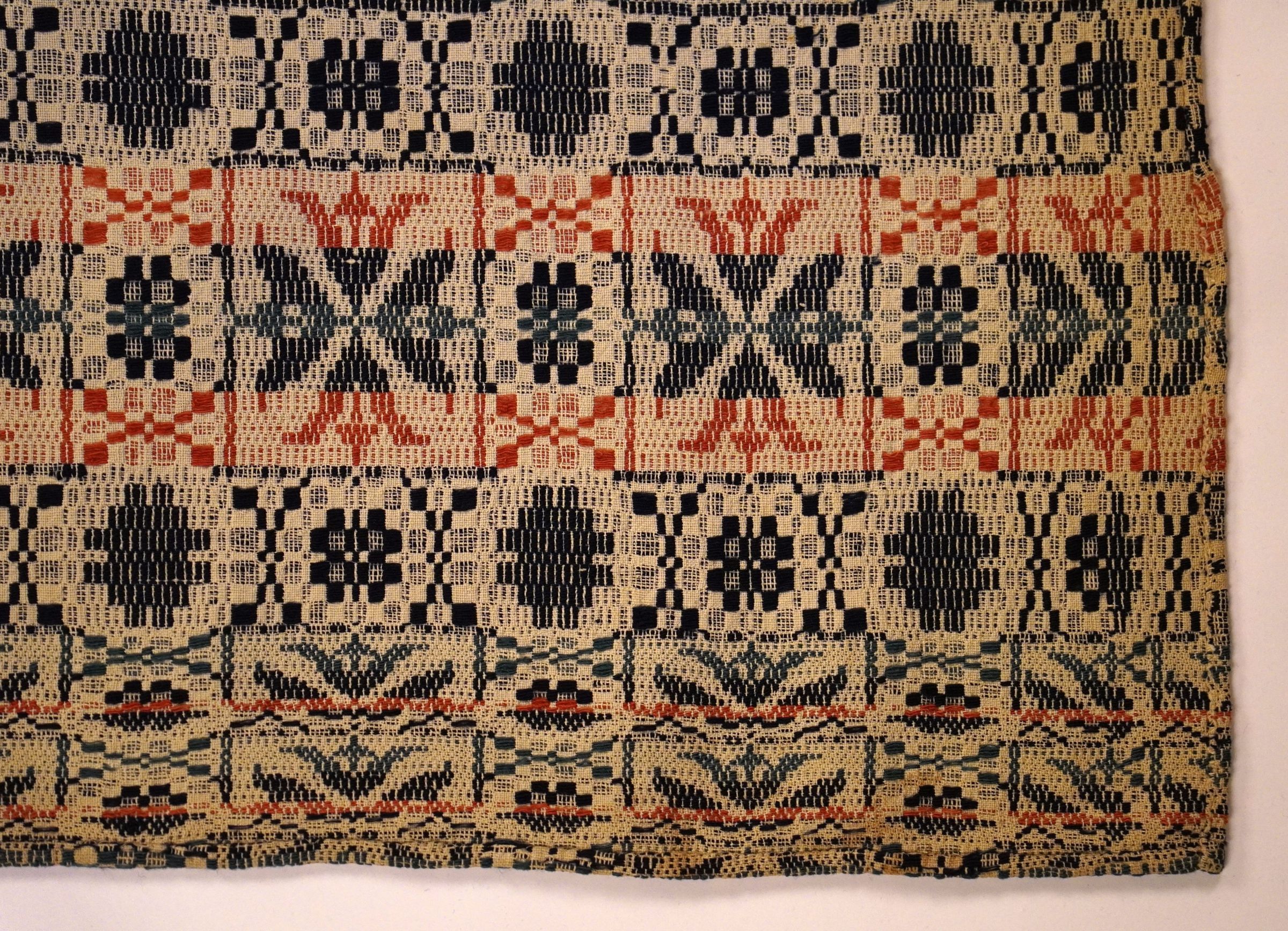 Red, blue, navy, and natural geometric floatwork coverlet with border on three sides.Collection
