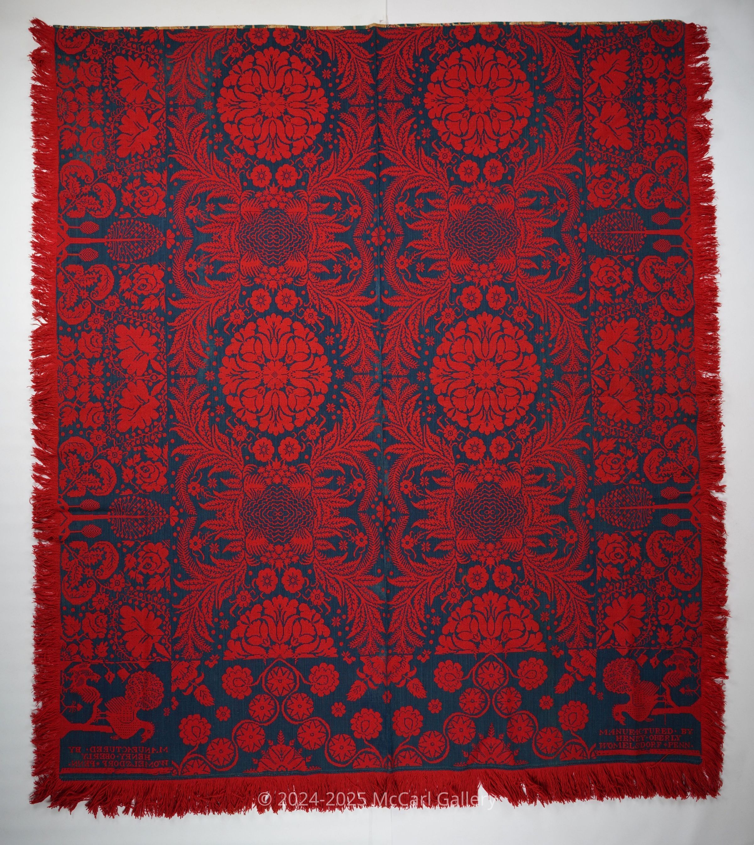 Navy and red figured tied half doublecloth coverlet with border and fringe on three sides. Two joined panels. Woven by Henry Oberly in Womelsdorf, Berks Co., Pennsylvania.Collection