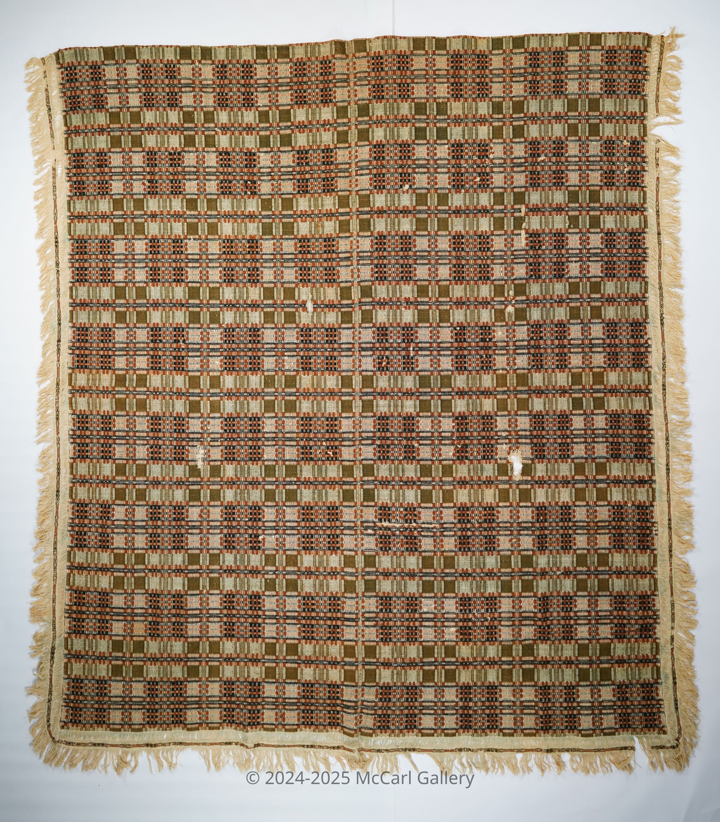 Red, navy, natural, and burnt sienna geometric overshot coverlet with fringe and border on three sides. Two joined panels.Collection