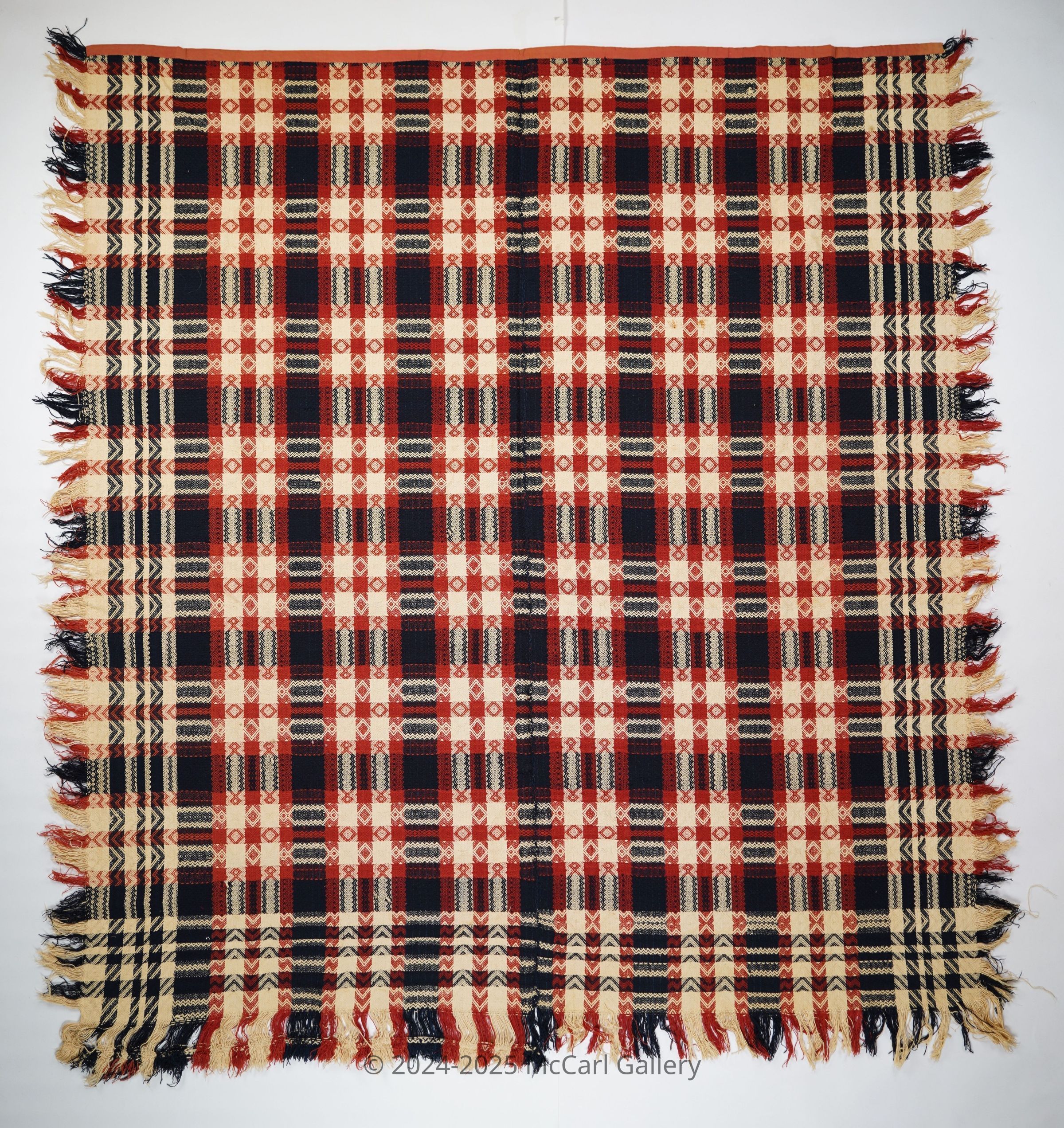Red, navy, and natural geometric twill coverlet with border and self-fringe on three sides. Two joined panels.