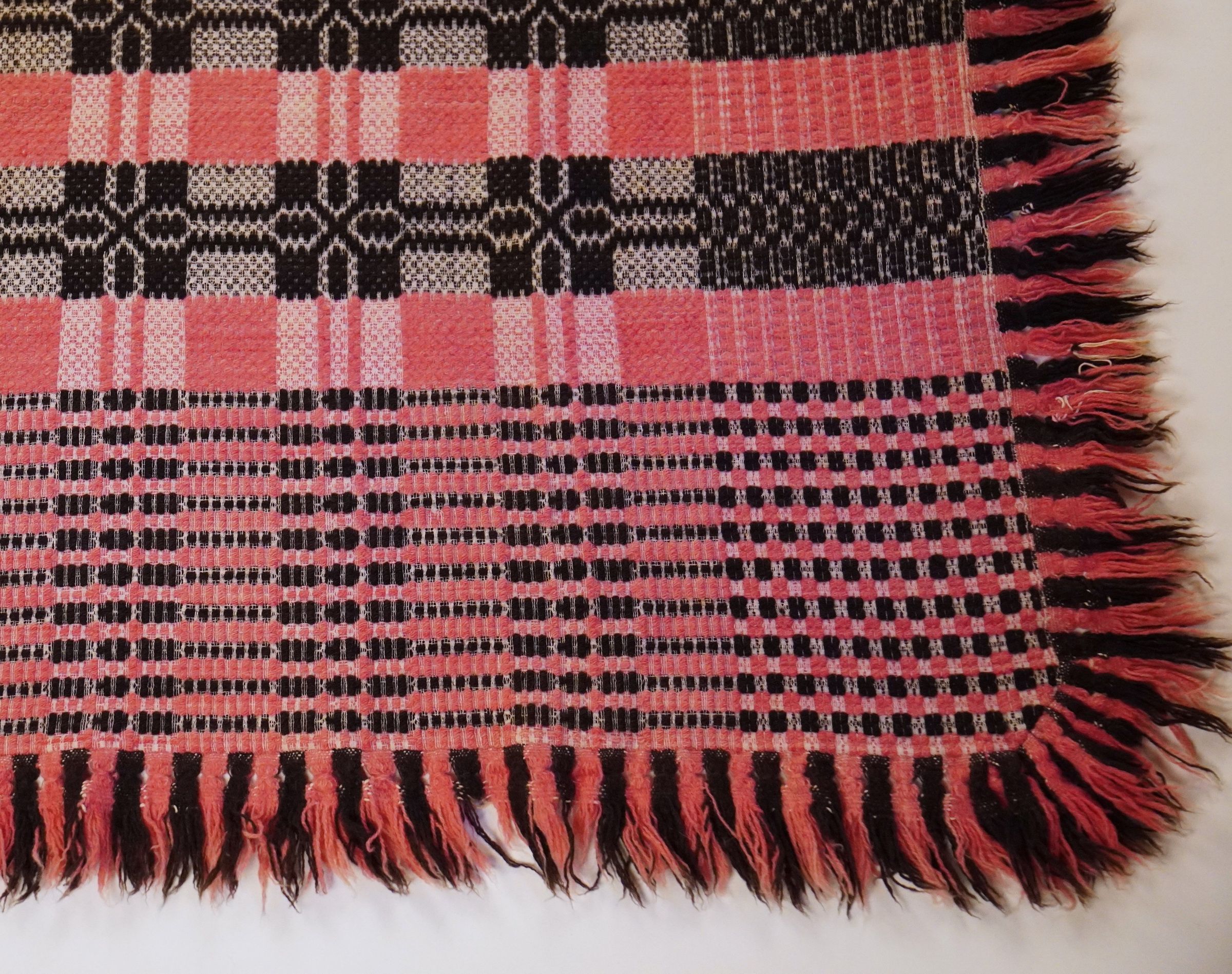 Pink, black, and natural geometric overshot coverlet with applied fringe on three sides and border on four sides.Collection