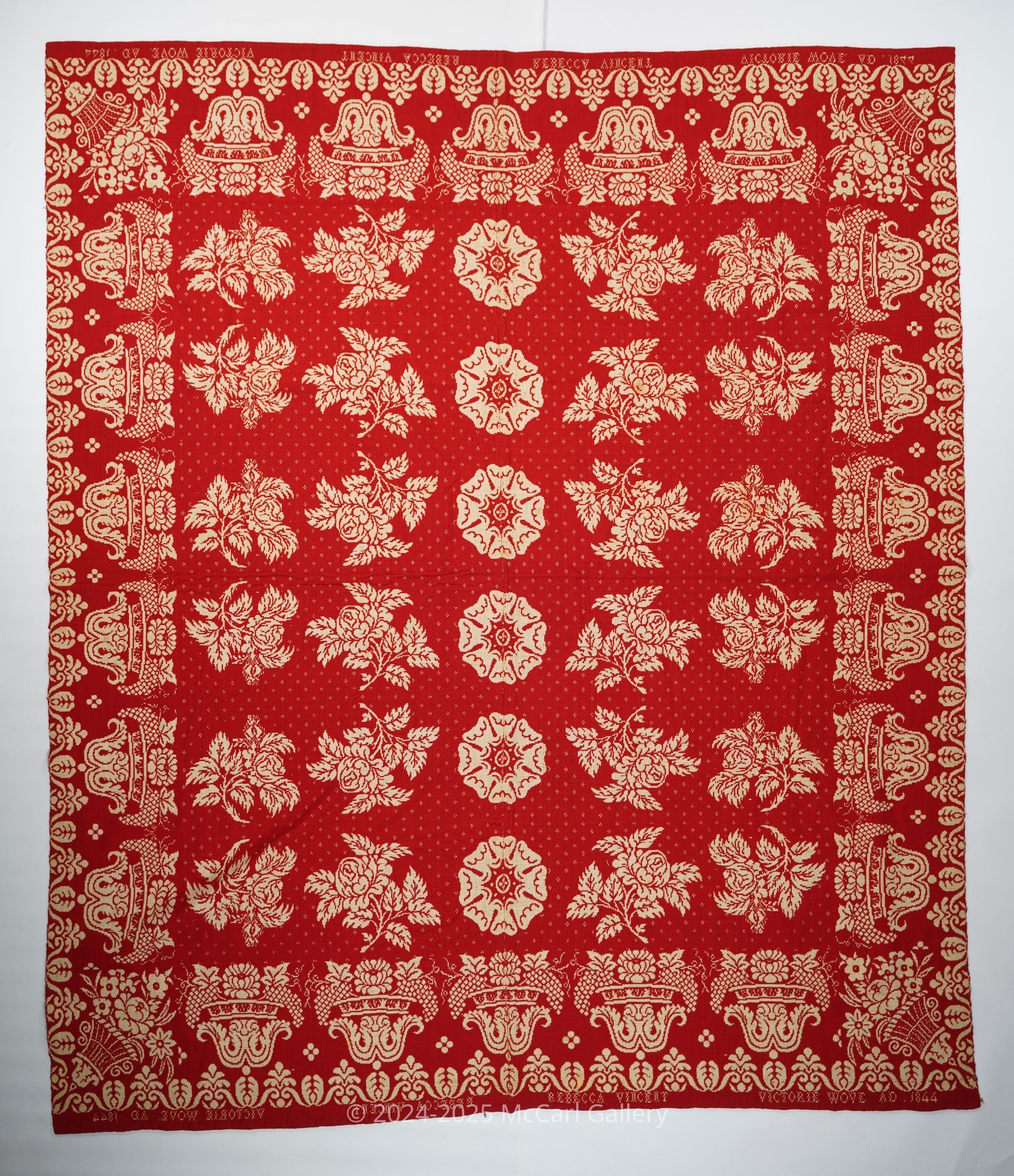 Red and natural figured double weave coverlet with border on four sides. Two joined panels. Woven for Rebecca Vincent in 1844.Collection