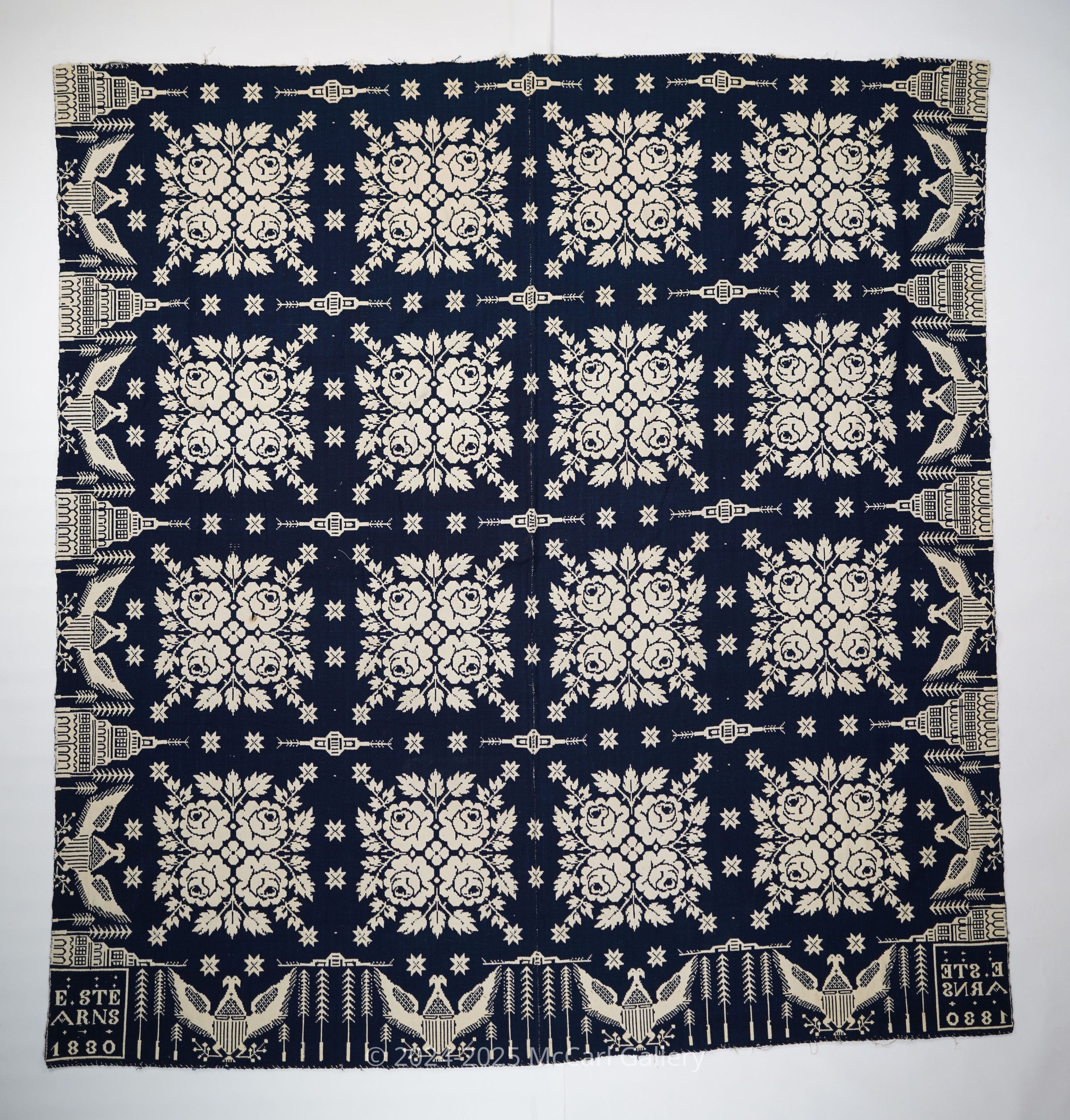 Navy and natural figured double weave coverlet with double-headed federal eagle border on three sides. Two joined panels. Woven for E. Stearns in 1830Collection