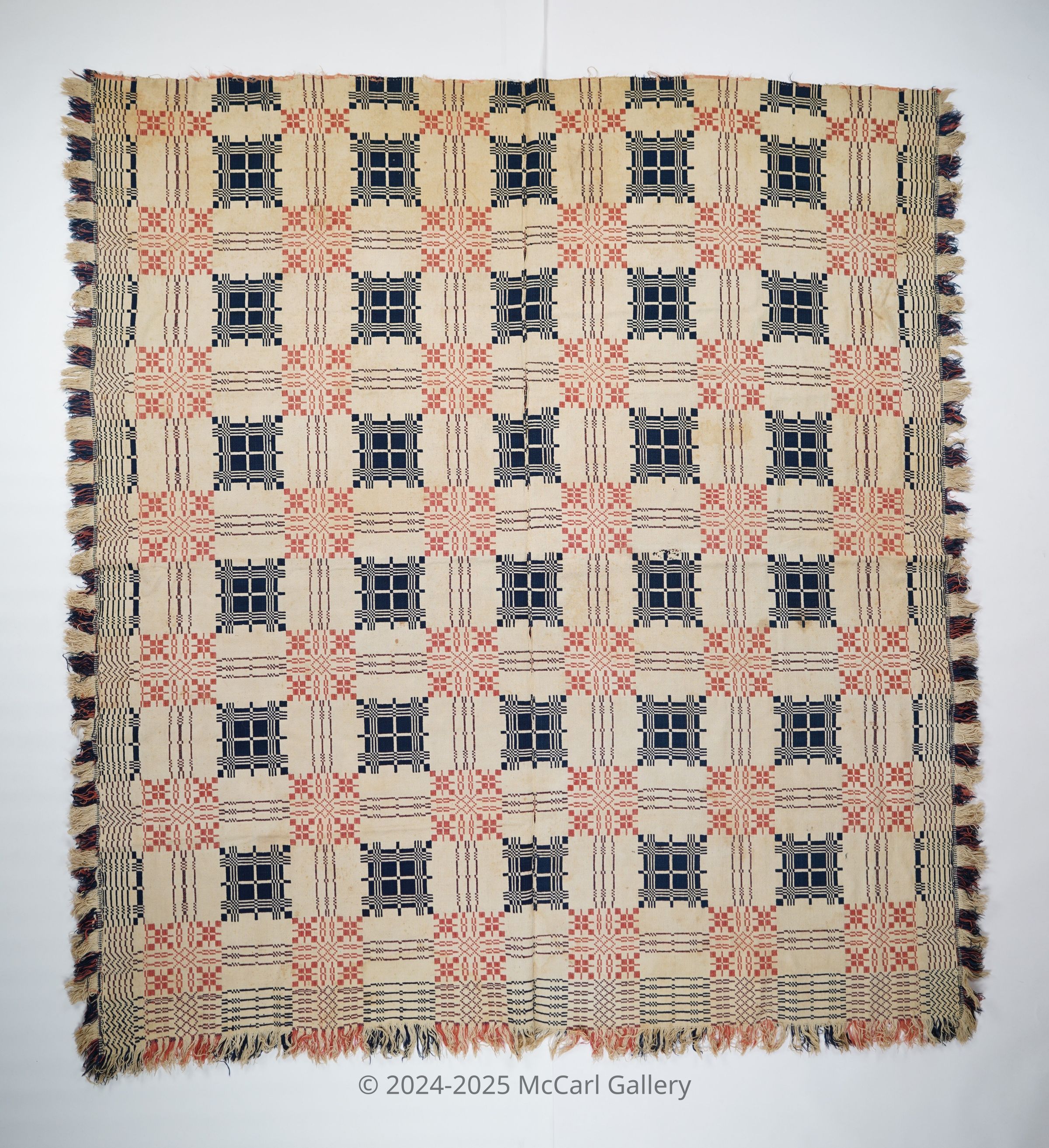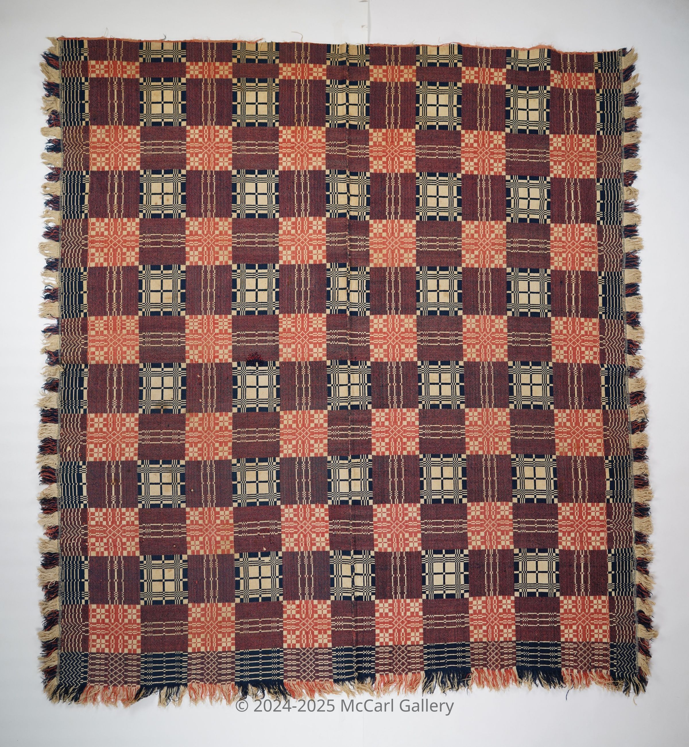 Pink, navy, and natural geometric double weave coverlet with border on three sides, applied fringe along left and right, and self-fringe along bottom. Two joined panels.Collection