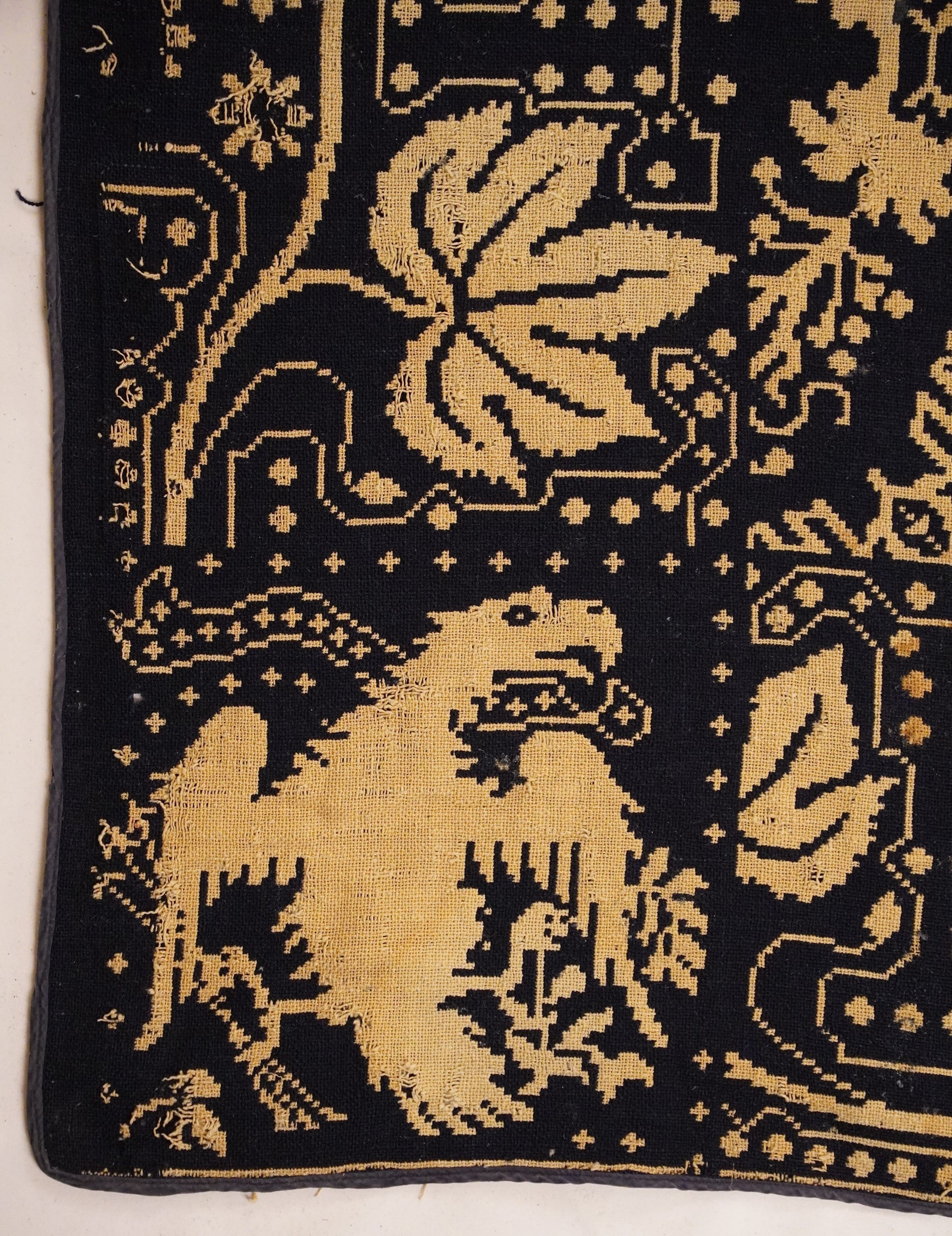 Natural and navy figured Double weave coverlet; two panels joined by a center seam. Border on four sides; no fringe; four cornerblocks with scruffy eagle. Holes along center seam and right side.Collection