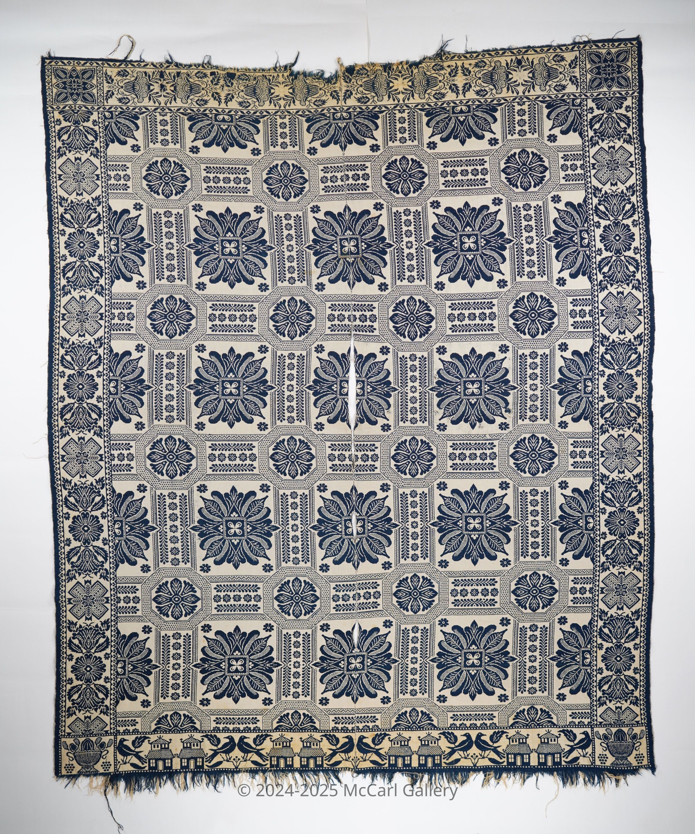 Navy and natural figured double weave coverlet with border on four sides and self-fringe along bottom. Two joined panels. Woven by Abraham Balantyne in Lafayette, Tippecanoe Co., Indiana, based on the Fruit Urn and Cruciform Flower cornerblocks.Collection