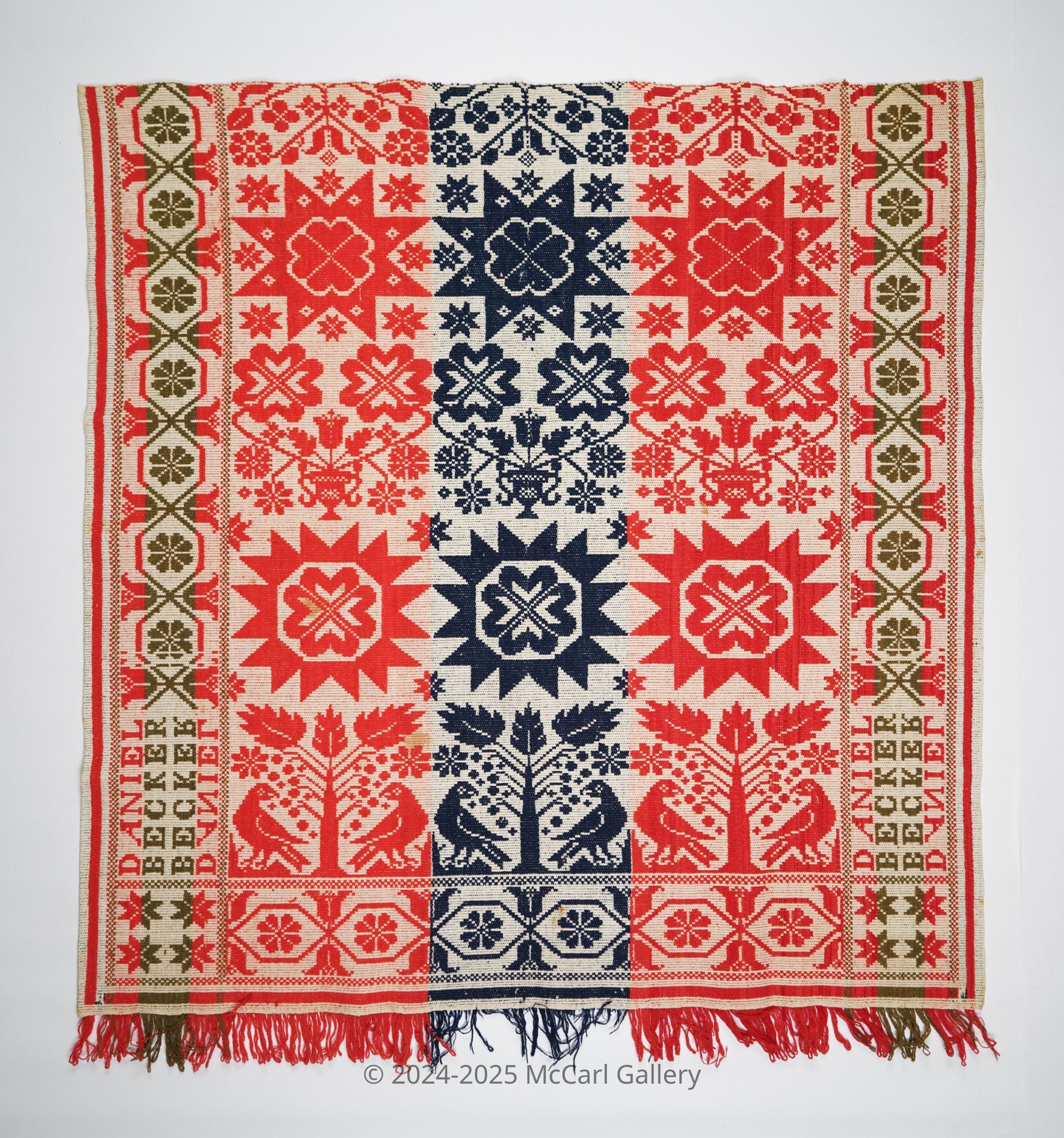 Red, green, navy, and natural figured tied half doublecloth crib coverlet with border on three sides and self-fringe along bottom. Woven by Daniel Becker.Collection