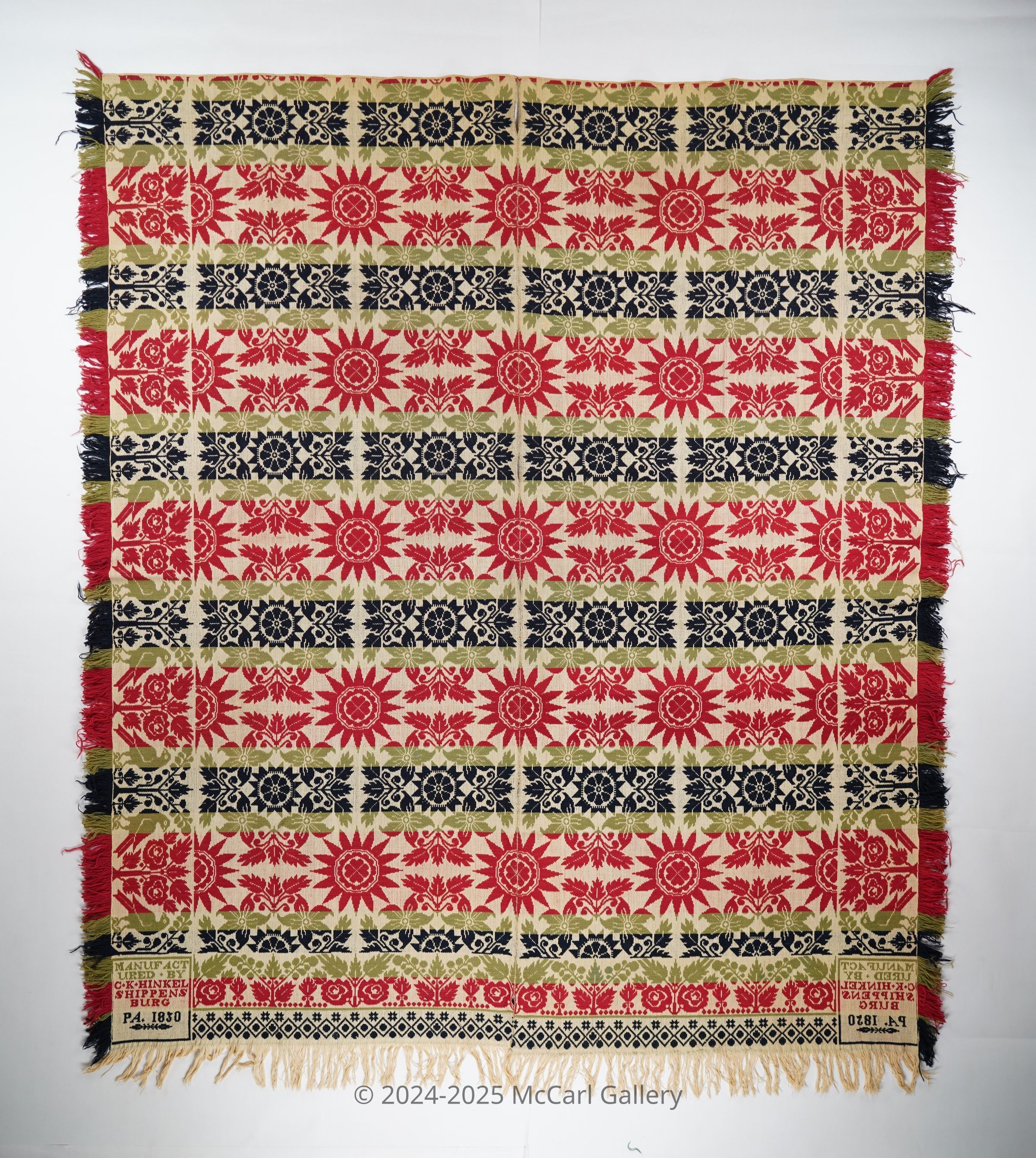 Figured and fancy tied beiderwand coverlet with borders on three sides and self-fringe on both sides and bottom. Two panels joined by a center seam. Navy, red, and green wool with undyed cotton. Lilies and sunburst centerfield pattern; distelfink and rosebush border on sides; floral rose border on bottom. Woven by Christian Hinkel in 1850.Collection