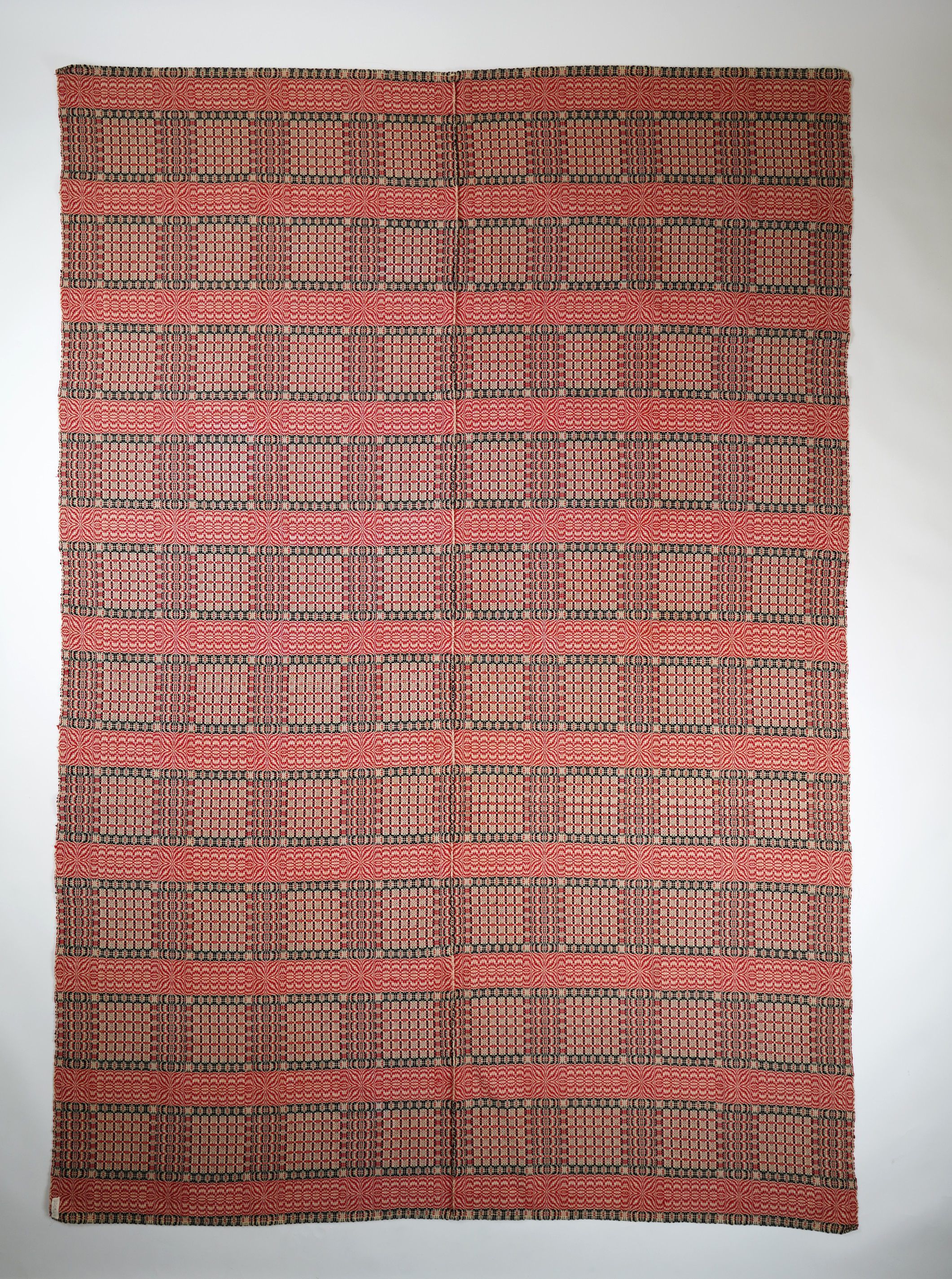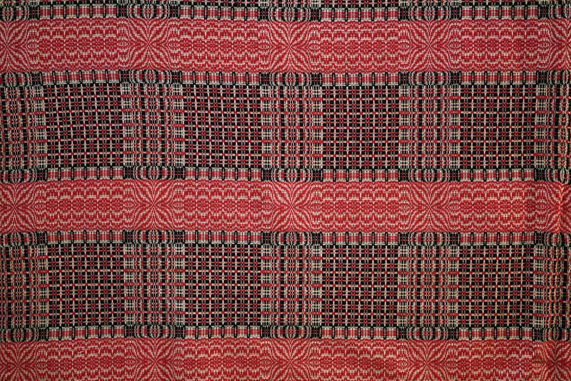 red, white and blue yarns; 2 pieces joined at a center seam; geometric overshot pattern that possibly includes the "Window Sash" and "Double Bow Knot" designs; no fringe and no corner blocksCollection