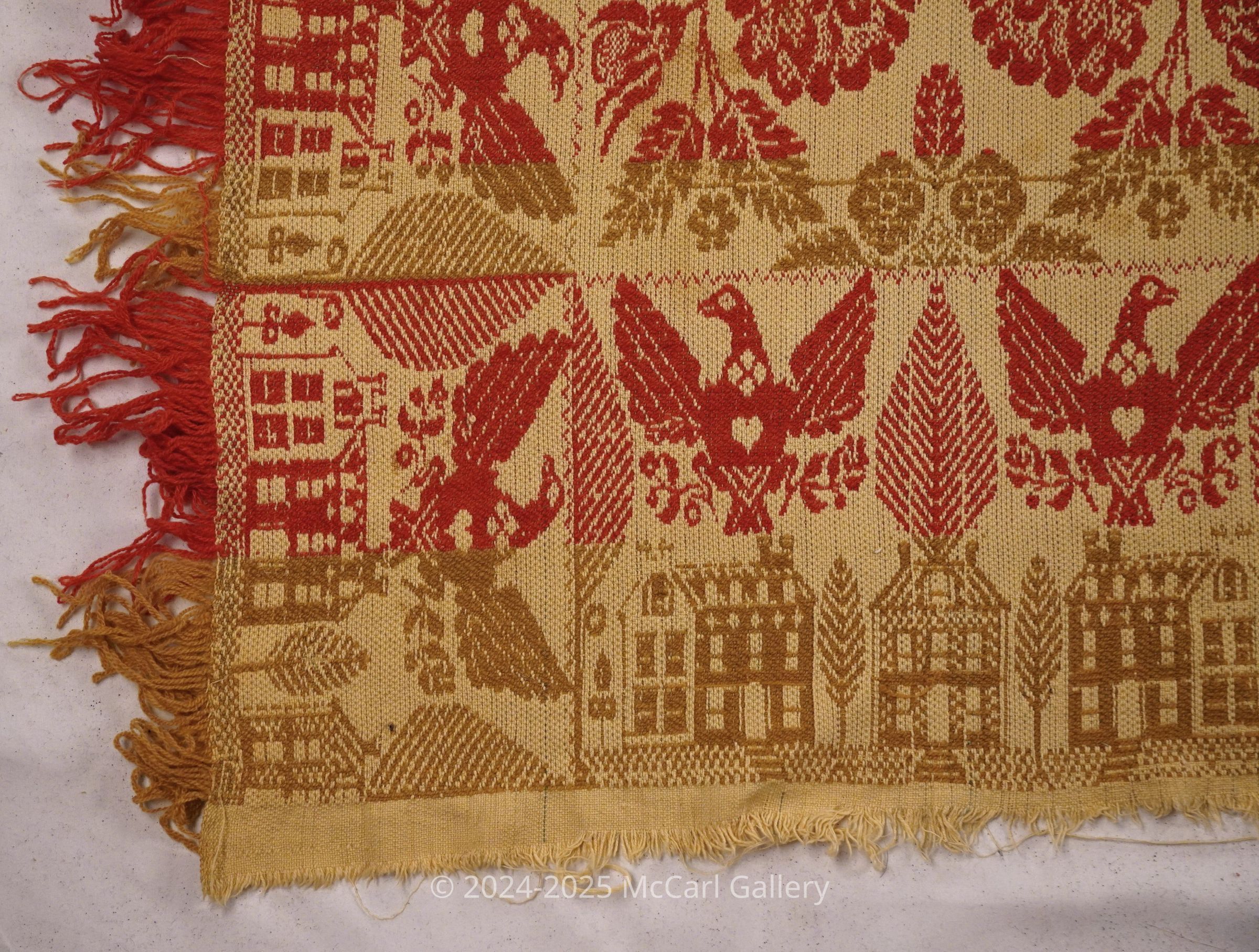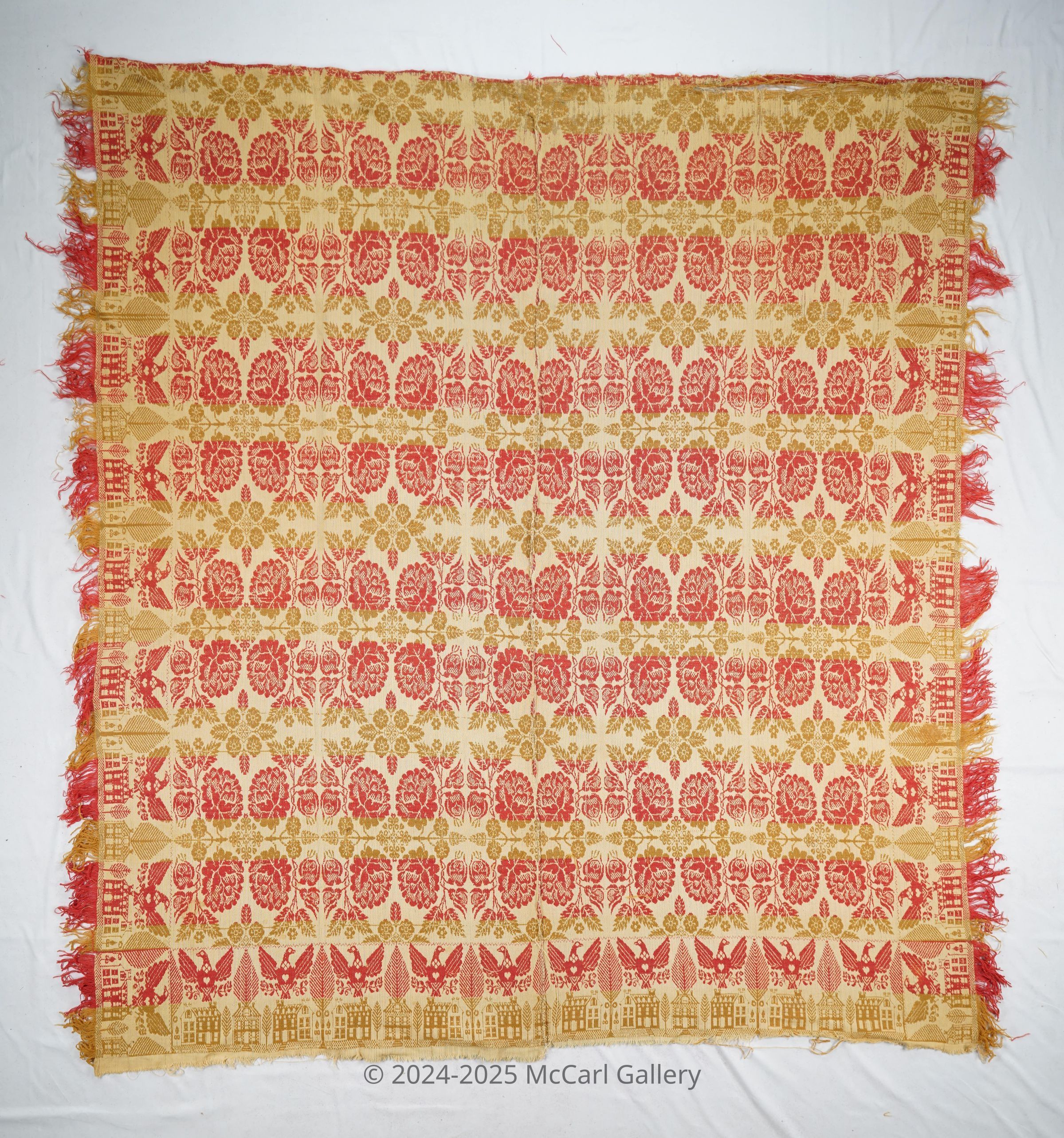 Natural, yellow, and red figured tied beiderwand 2:1 coverlet; two panels joined by a center seam. Fringe on two sides; border on three sides.