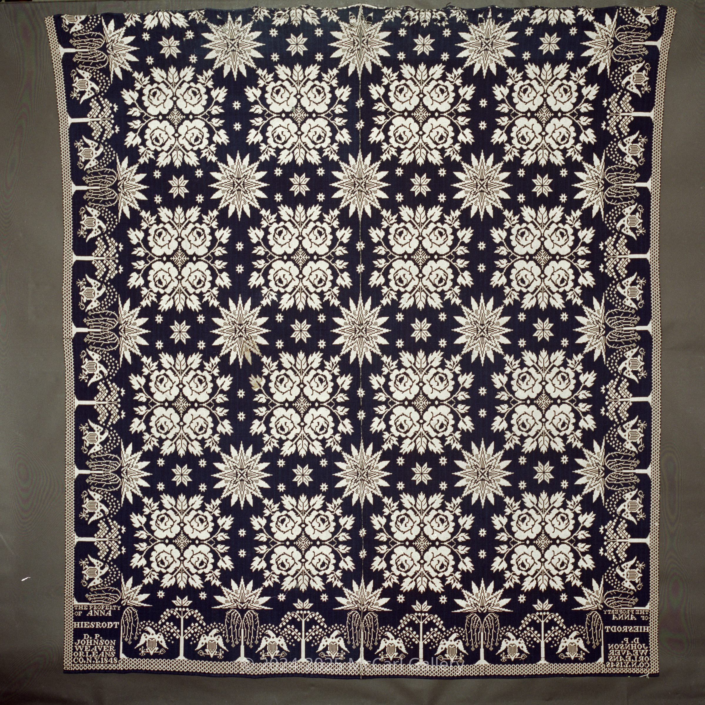 double weave; navy, natural; two loom widths joined; central rose and floral pattern; repeating eagle and tree border with a geometric edge; signature corner blocks; no fringeCollection