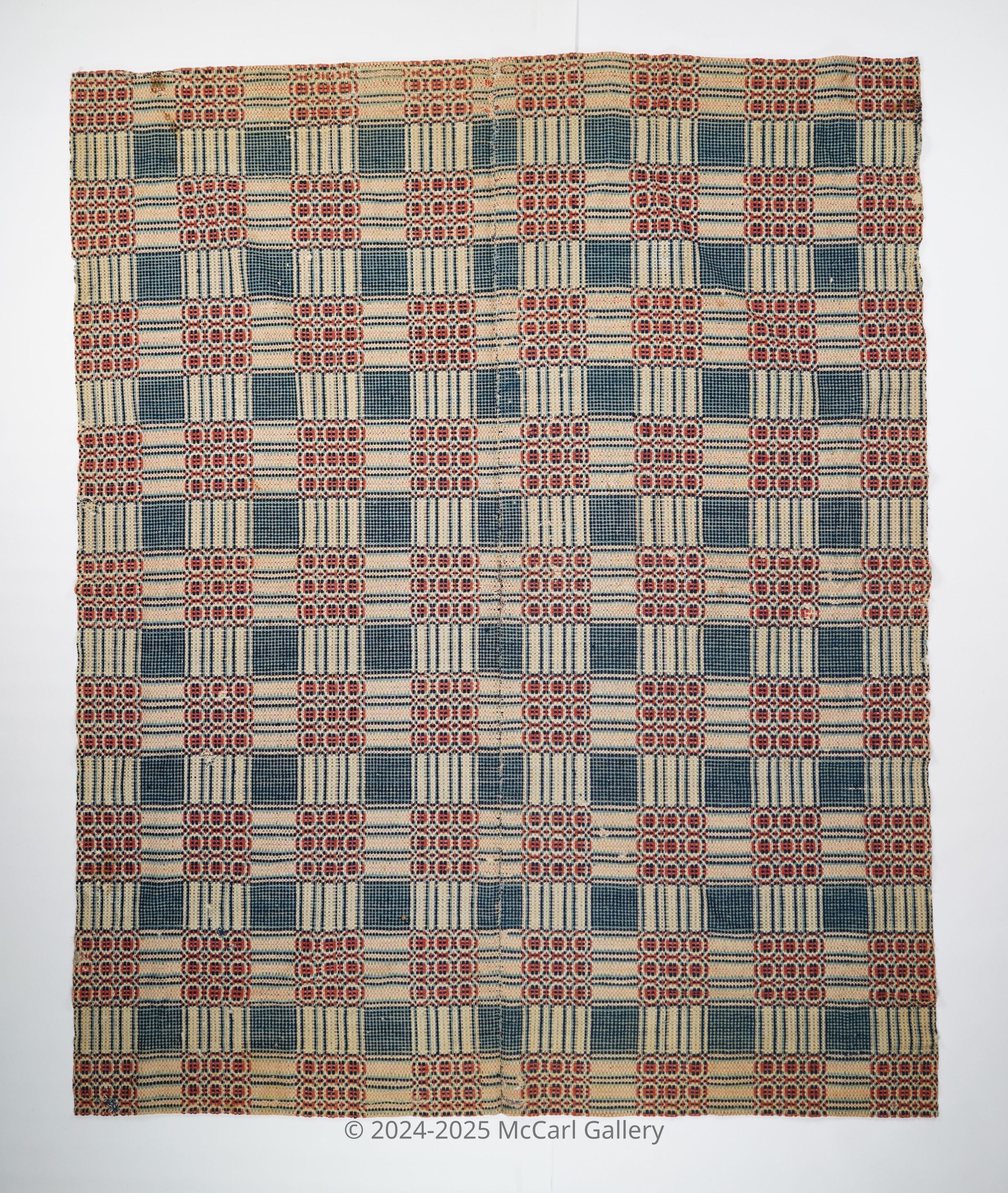 Red, blue, navy, and natural geometric overshot coverlet. Two joined panels.