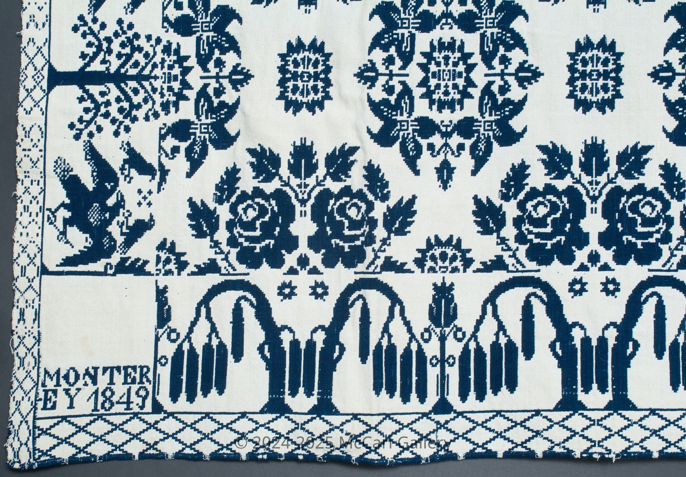 blue and natural; double weave; two loom widths joined; central rose motif; bird and tree border on left and right; tree border on bottomCollection