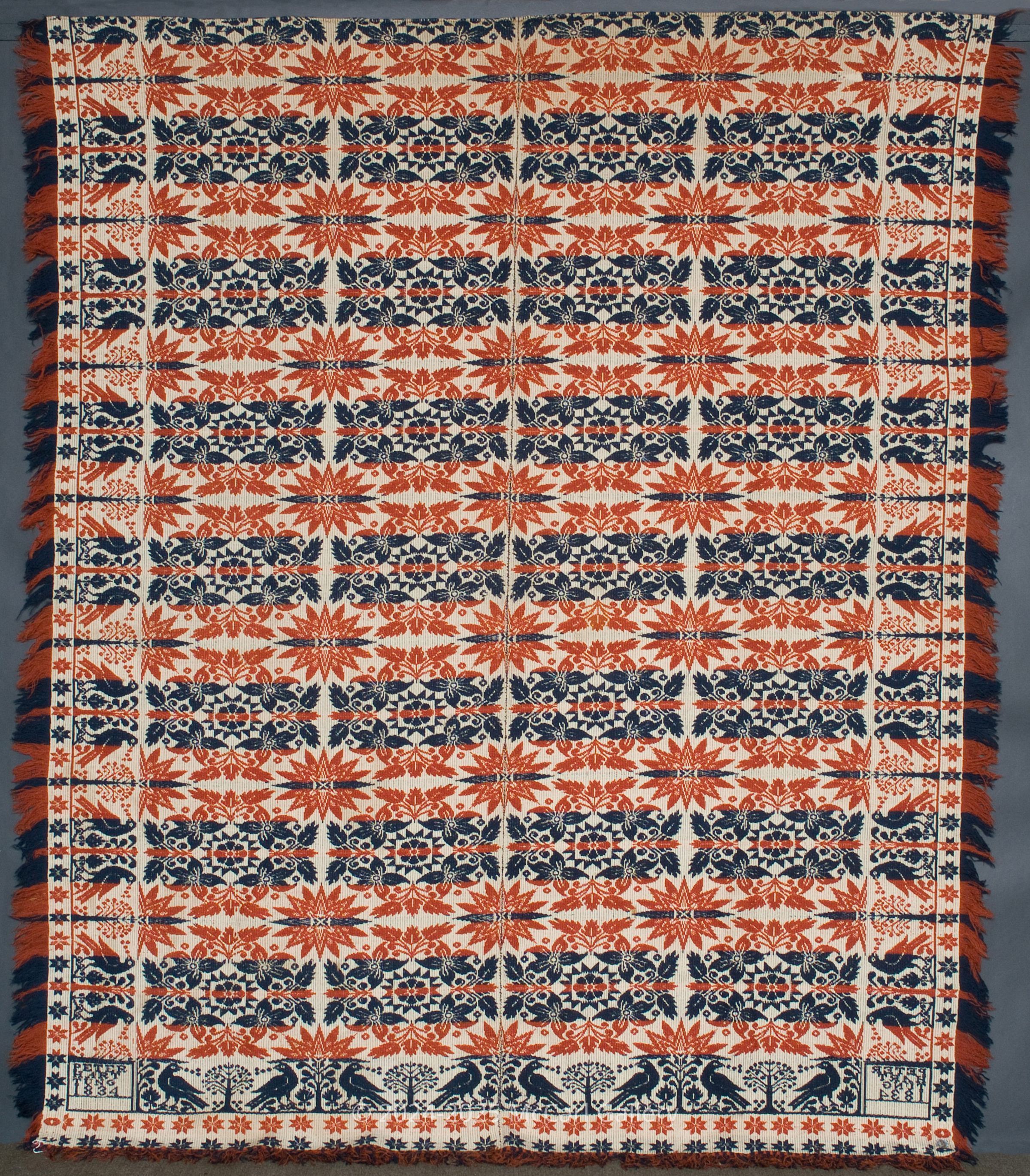 single weave; navy, red, and natural; two loom widths joined; fringe on 3 sides; floral centerfield; star, tree, and bird border; signature corner blocks on LL, LR