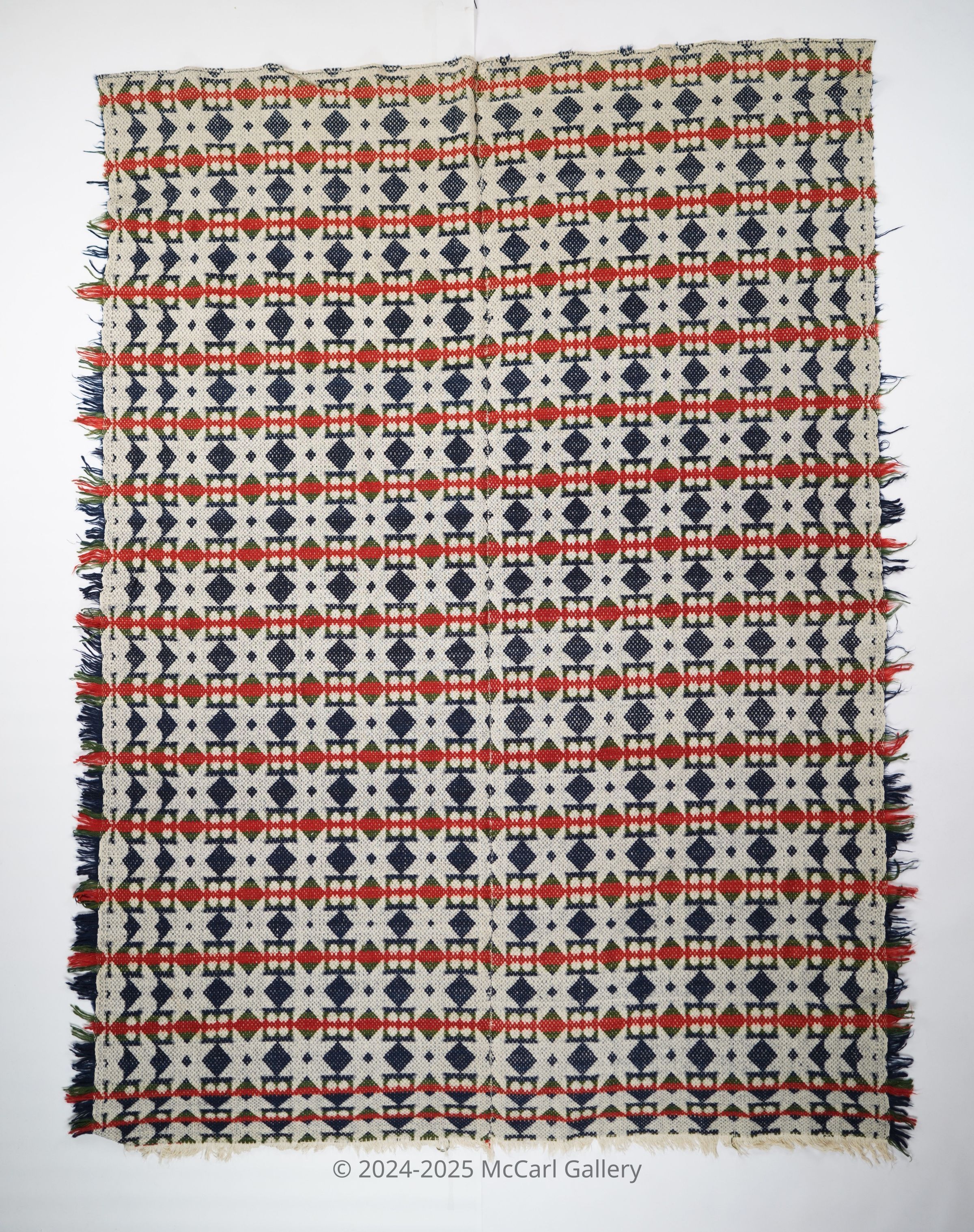 Red, green, navy, and natural geometric starwork coverlet with border and self-fringe on three sides. Two joined panels.Collection