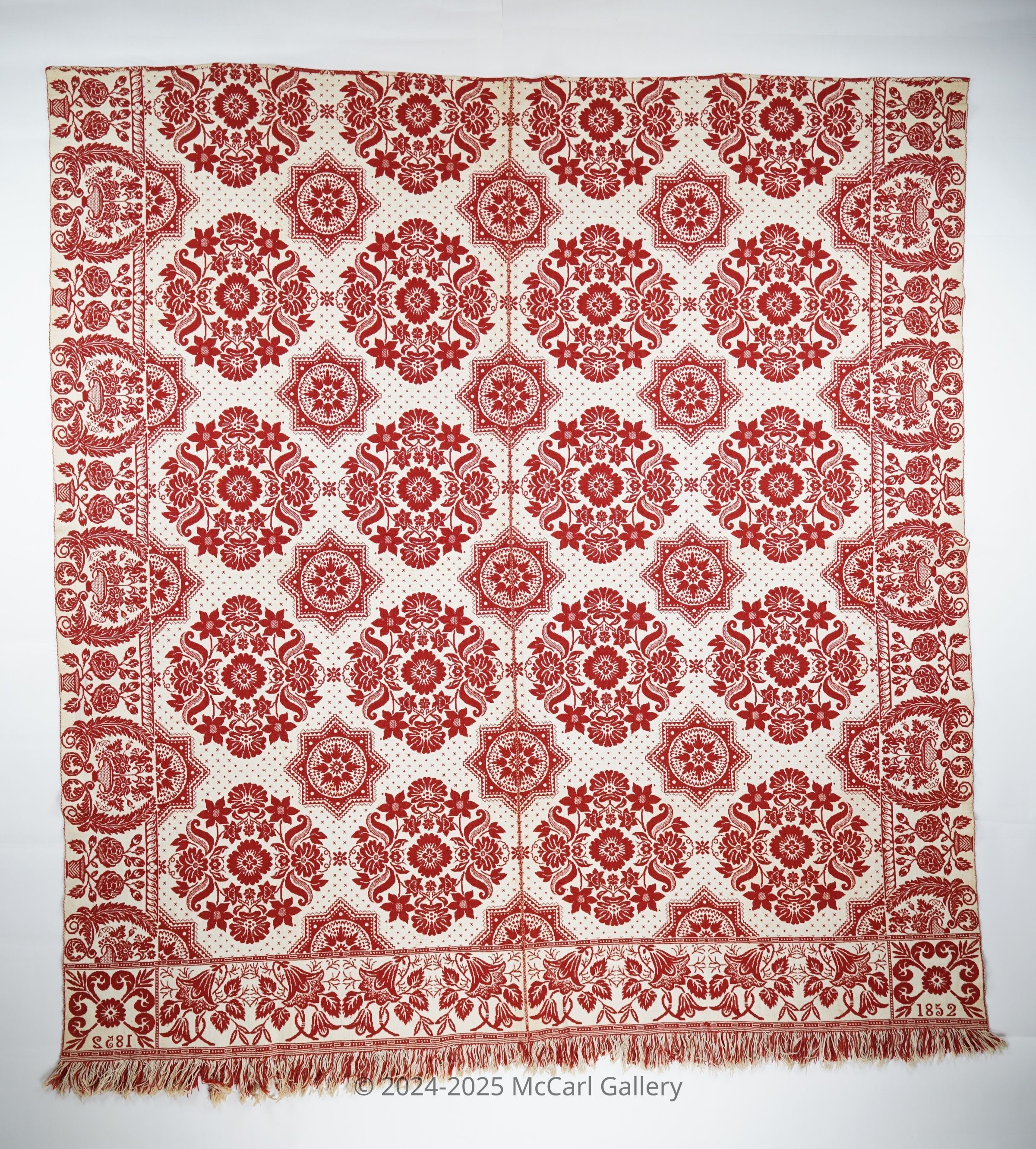 Red and natural figured doubleweave coverlet with border on three sides and self-fringe along bottom. Two joined panels. Woven in 1852.Collection