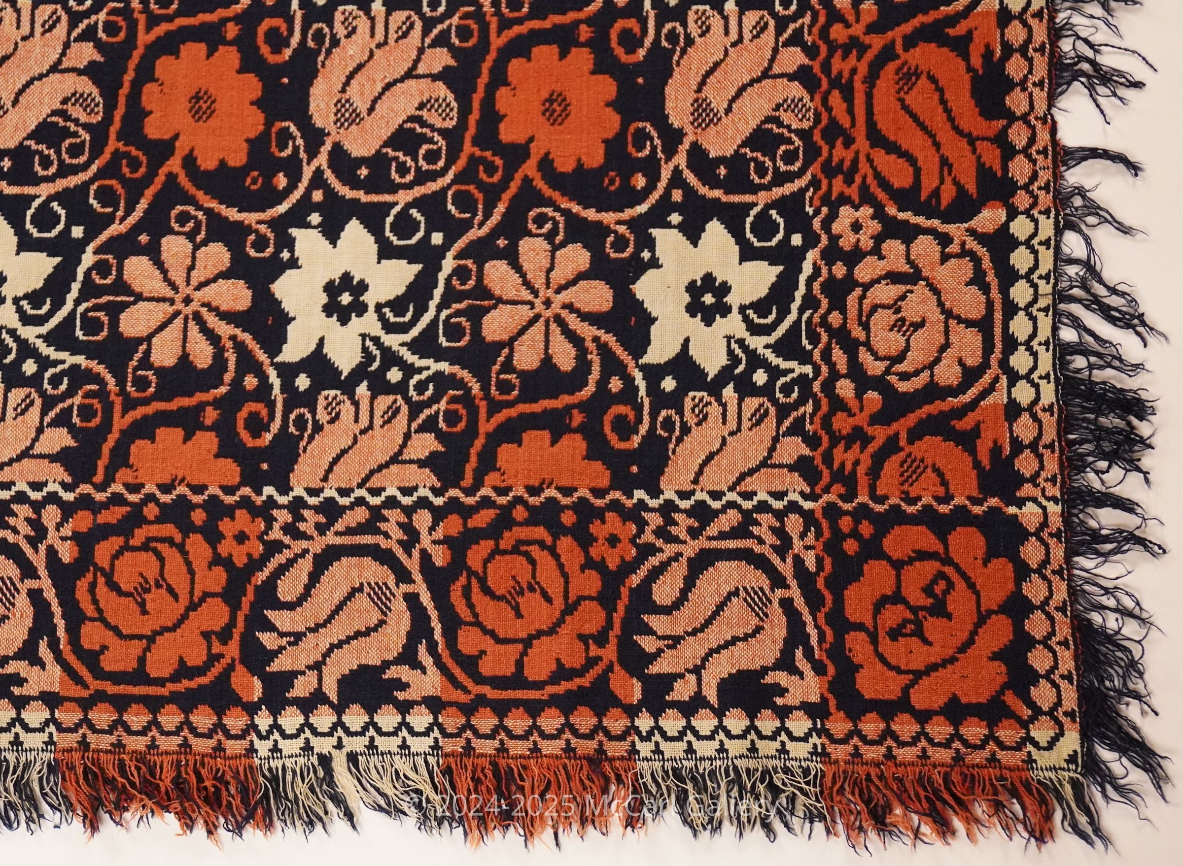 Red, navy, and natural figured double weave coverlet with border on four sides and self-fringe on three sides. Seamless.