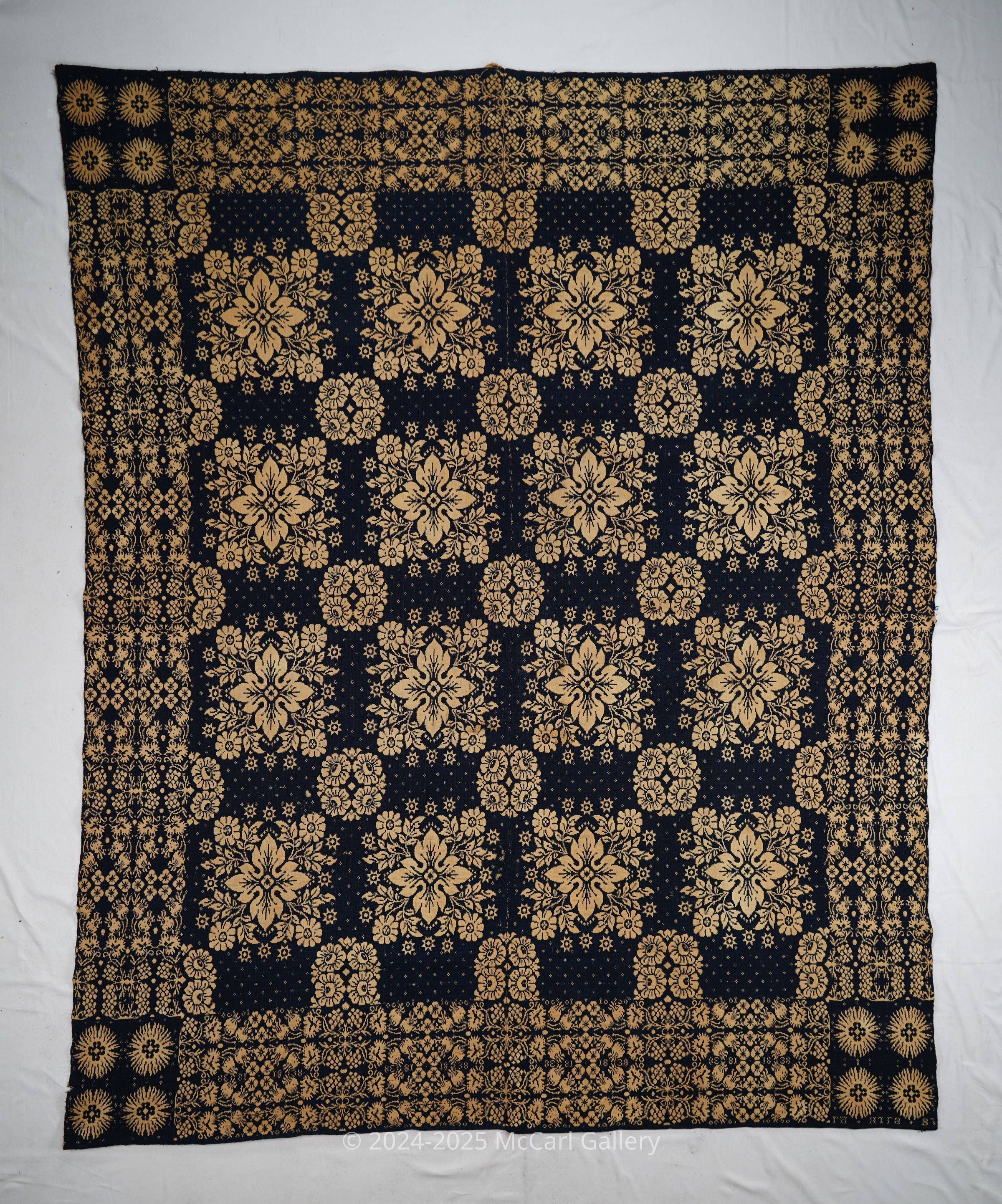 Natural and navy figured double weave coverlet; two panels joined by a center seam. Border on four sides; no fringe.Collection