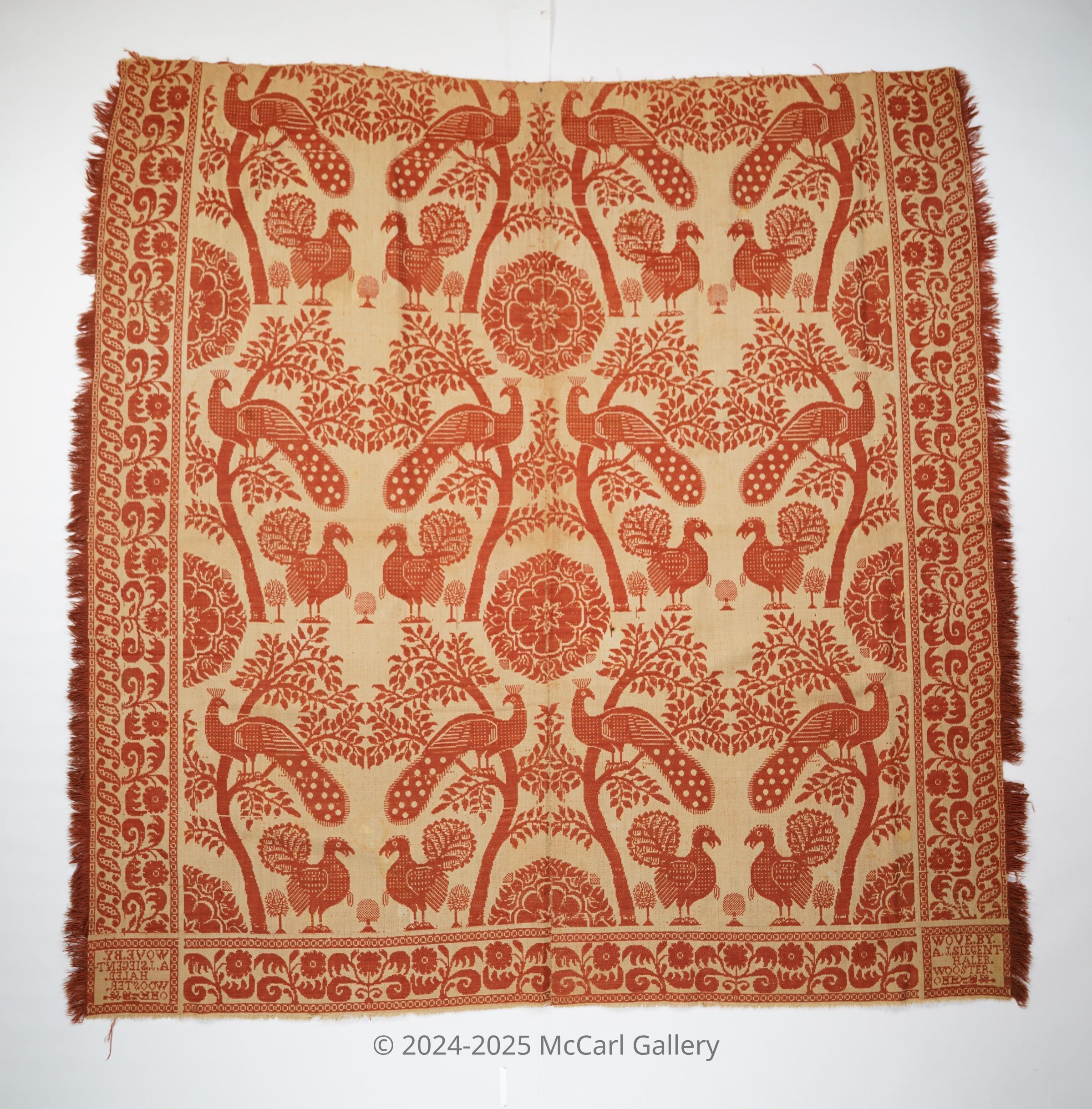 Burnt sienna and natural figured tied beiderwand coverlet with border on three sides and self-fringe on left and right sides. Two joined panels. Woven by J. A. Siegenthaler in Wooster, Wayne Co., Ohio in 1858.Collection