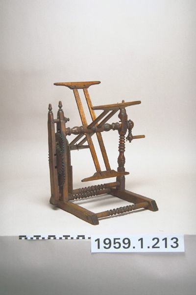 Small size, elaborate turnings, double reel arms, HI burnt into one reel top. An open 4 sided base supports 2 vertical uprights between which hangs a 4 armed reel with crutch tops and a clock face with 2 dials. The gears are hung between one upright and a partial post attached to it from cross bars.Collection