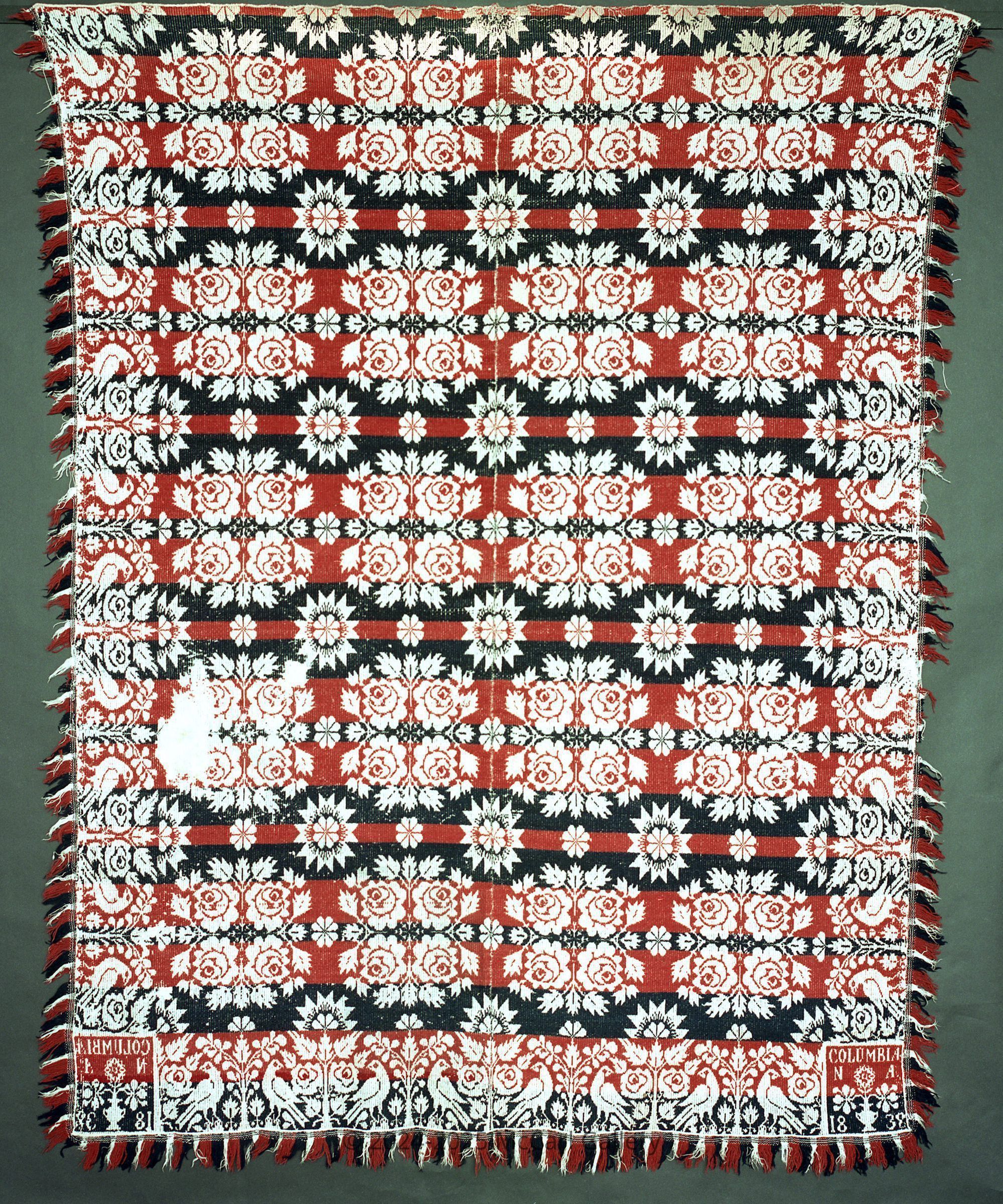 red, navy, natural; two loom widths joined; fringe on 3 sides; center rosette clusters and flowers inside stars; border on 3 sides distel fink and birgds and trees and rosettesCollection