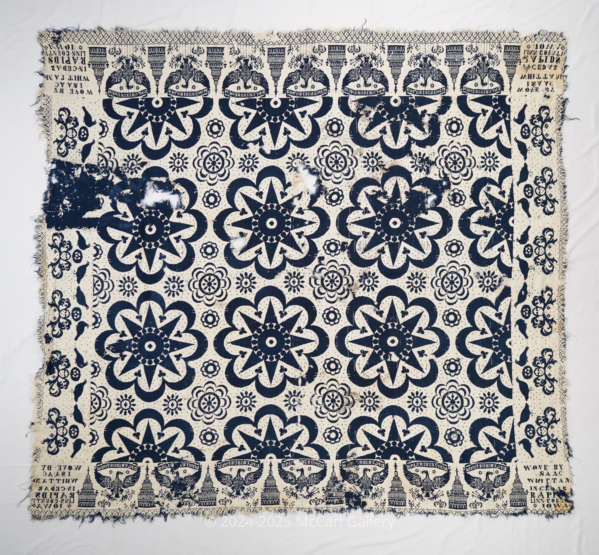 Natural and navy figured double weave coverlet; seamless. Border and fringe on four sides.Collection