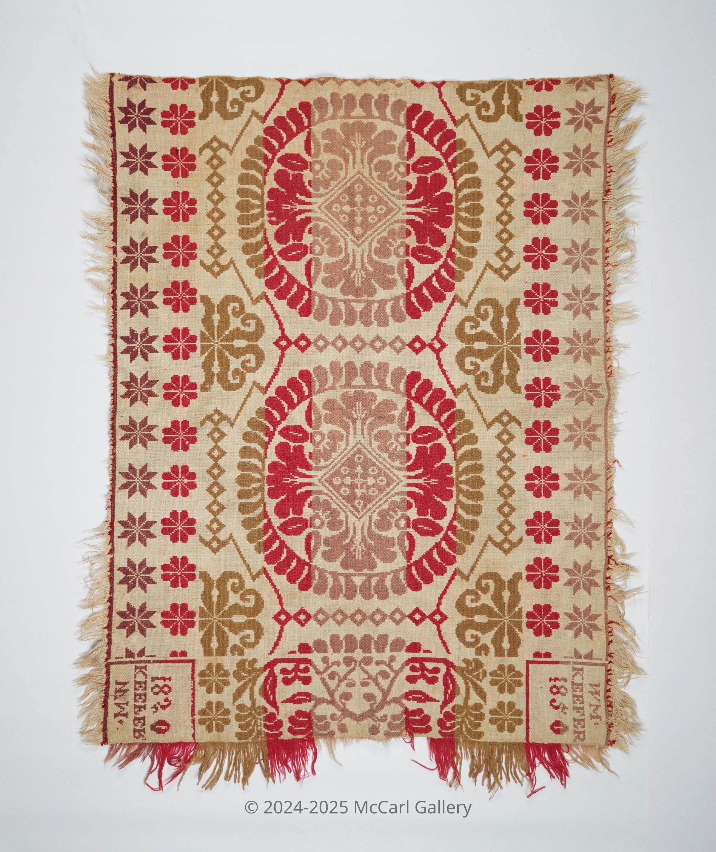 Yellow, purple, lavender, red, and natural figured half doublecloth crib coverlet with border and self-fringe on three sides. Woven by William Keefer in 1850.Collection