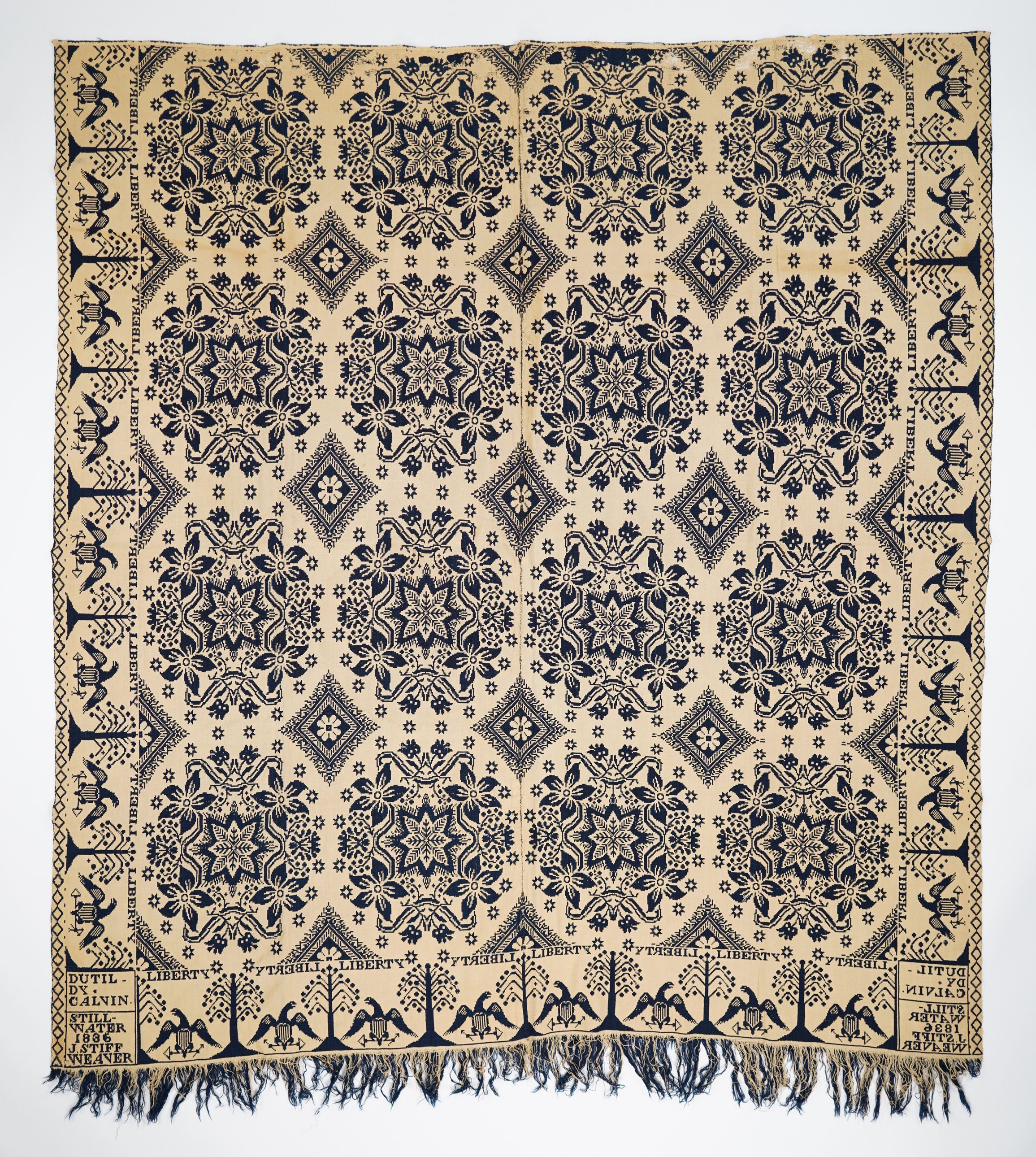 Navy and natural figured double weave coverlet; two panels joined by a center seam; self-fringe on bottom edge only; shielded eagle border on three sides; lilies of france centerfield pattern with diamonds.Collection