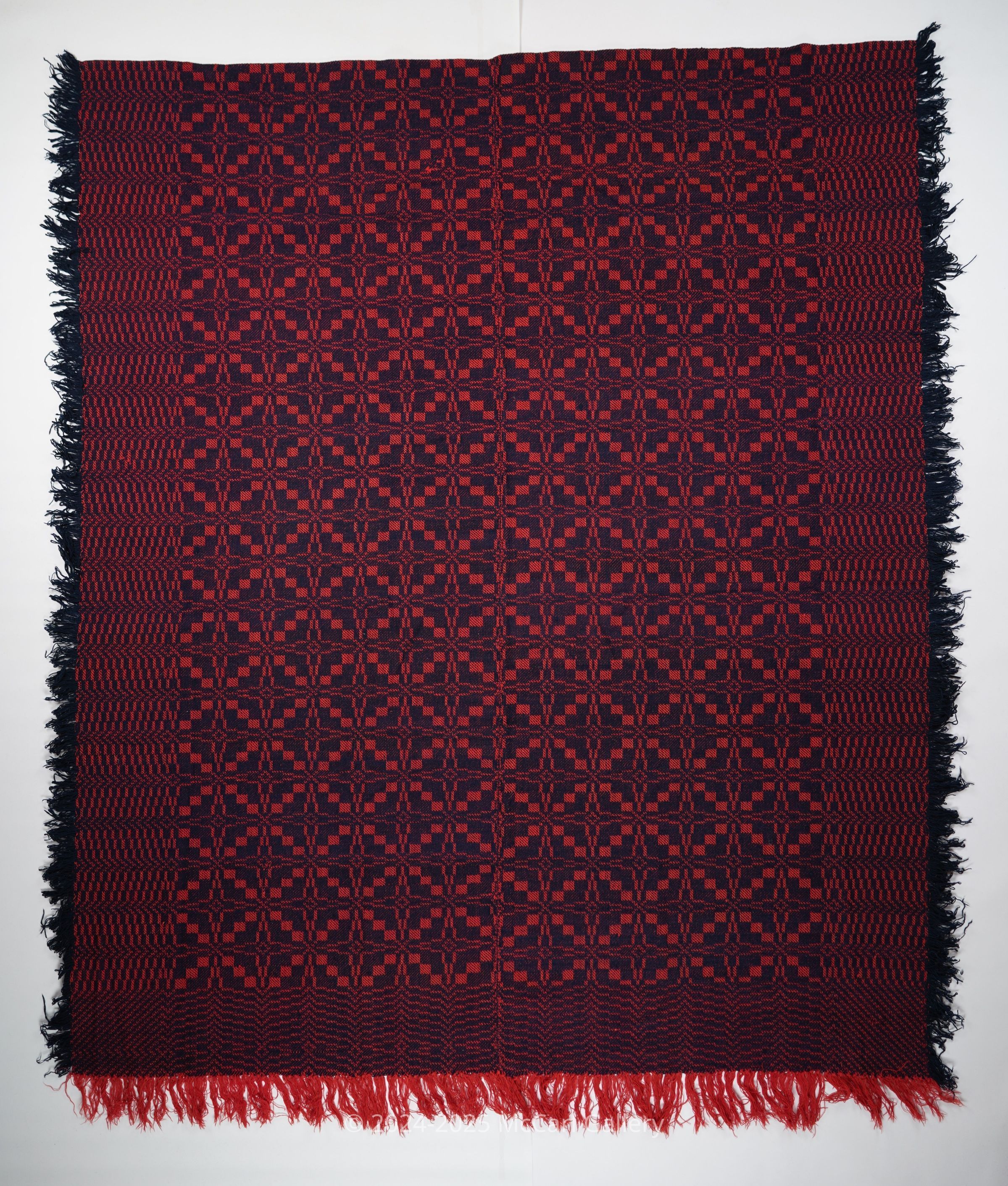 Navy and red geometric block twill coverlet with border and self-fringe on three sides. Two joined panels.