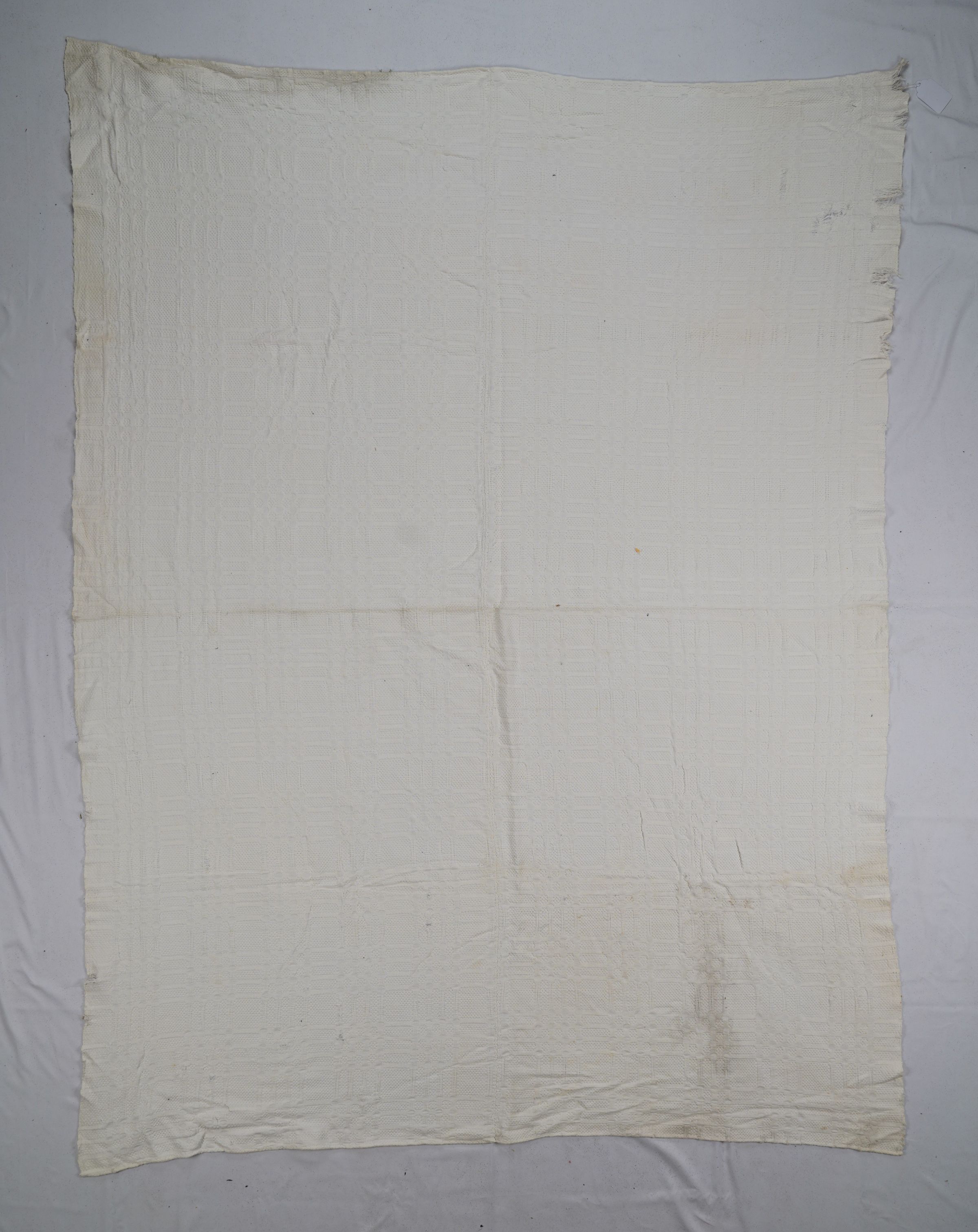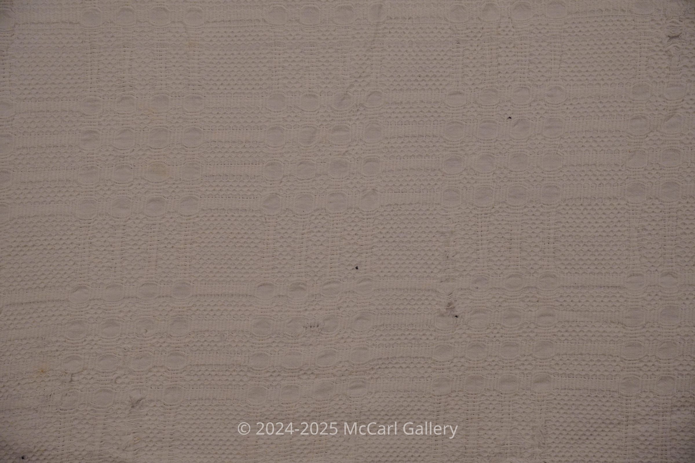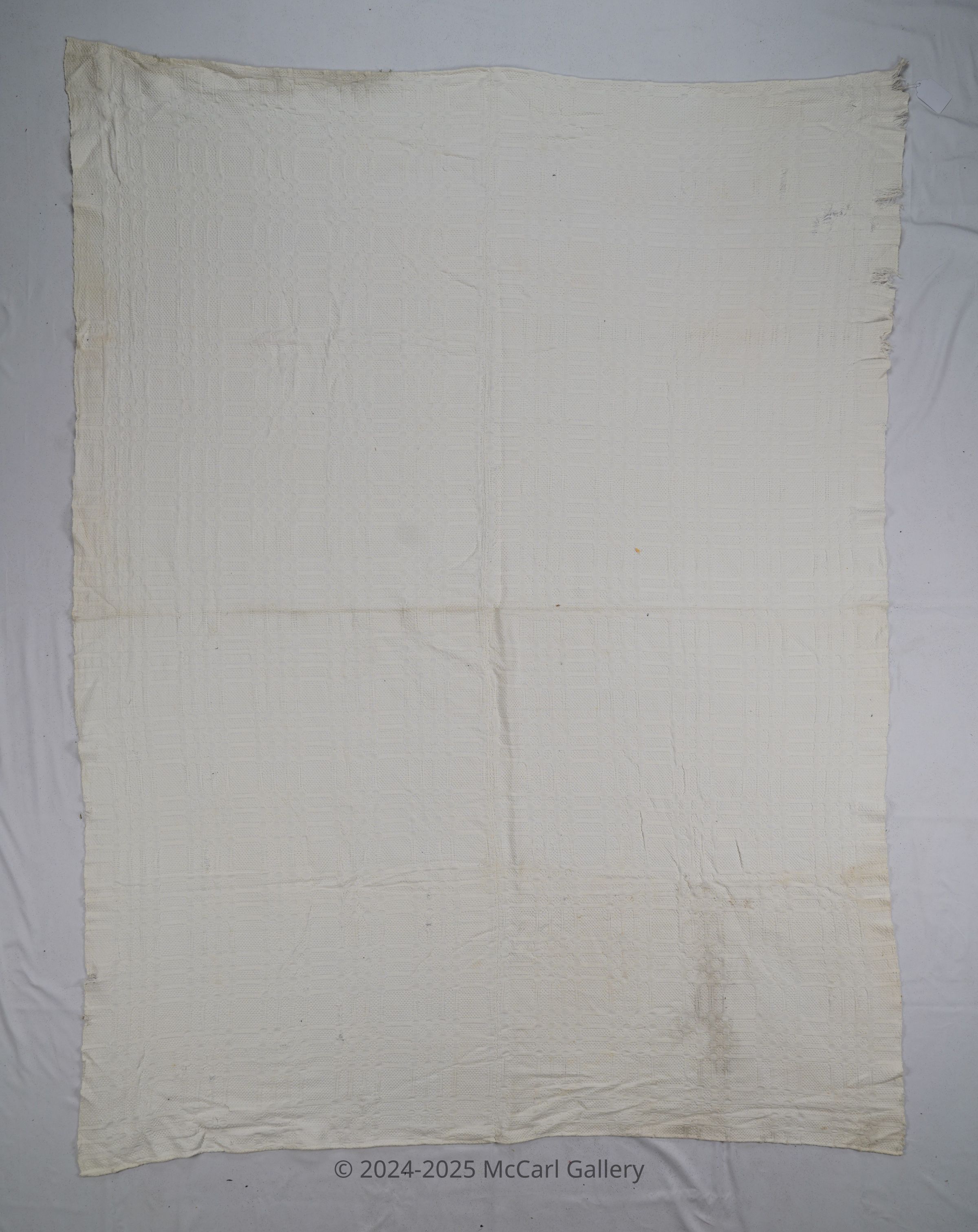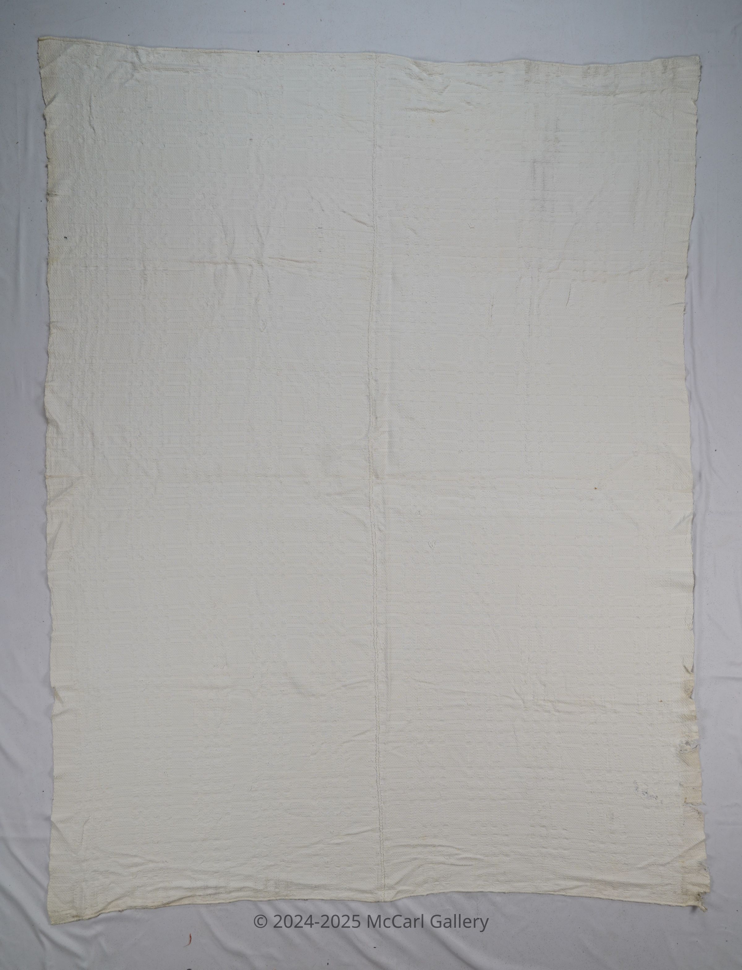 White geometric M's and O's counterpane coverlet; two panels joined by a center seam. No fringe or border.