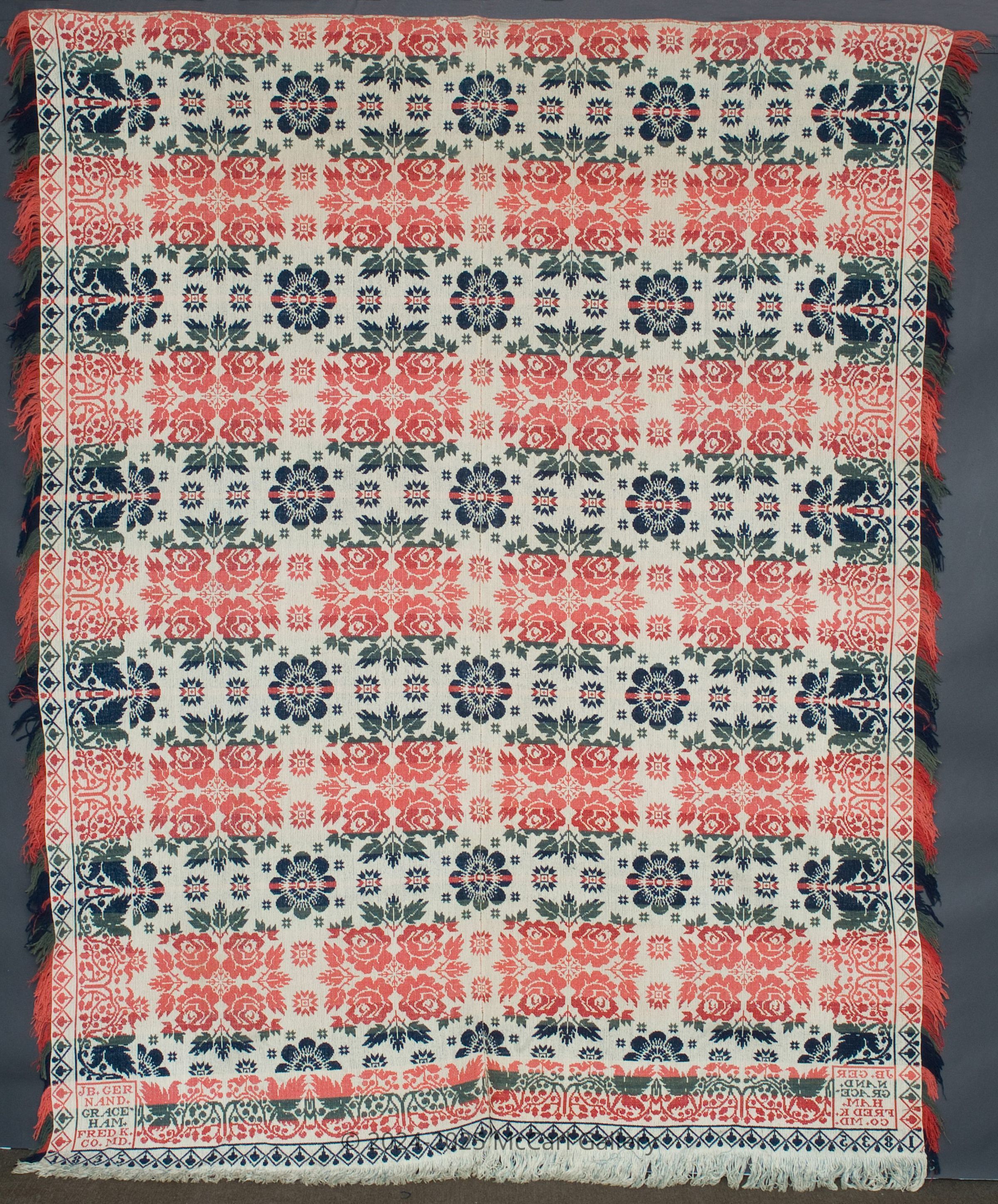 pink, red, green, navy, white; fringe on 3 sides; two loom widths; border on 3 sides of grapevine; two corner blocks; center rosette clusters with flowers betweenCollection