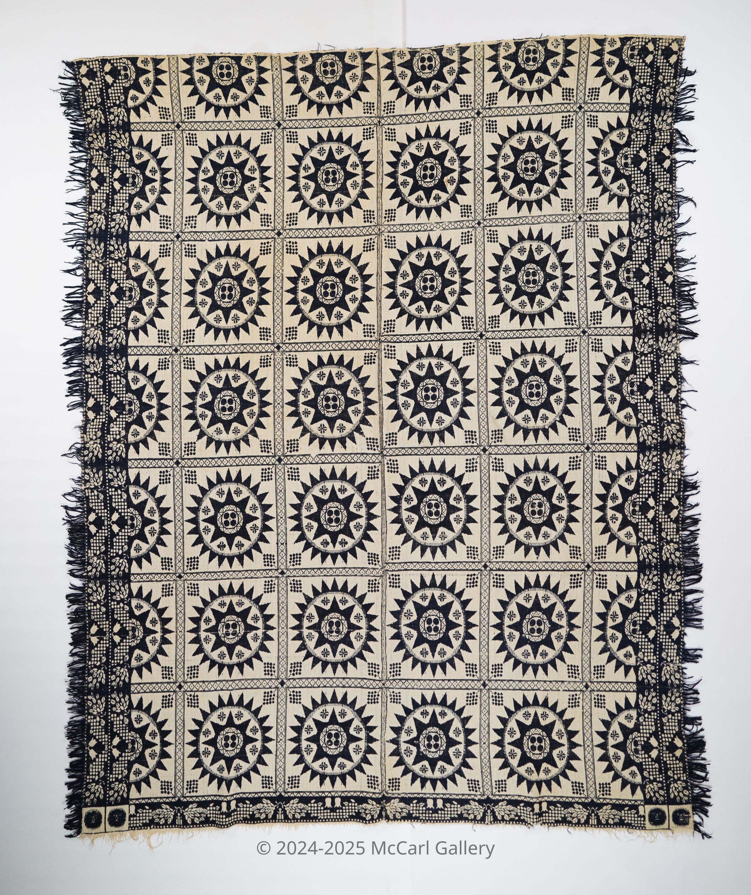 Navy and natural figured tied beiderwand coverlet with self-fringe and grapes border on three sides. Two joined panels. Double face cornerblock trademarks.Collection