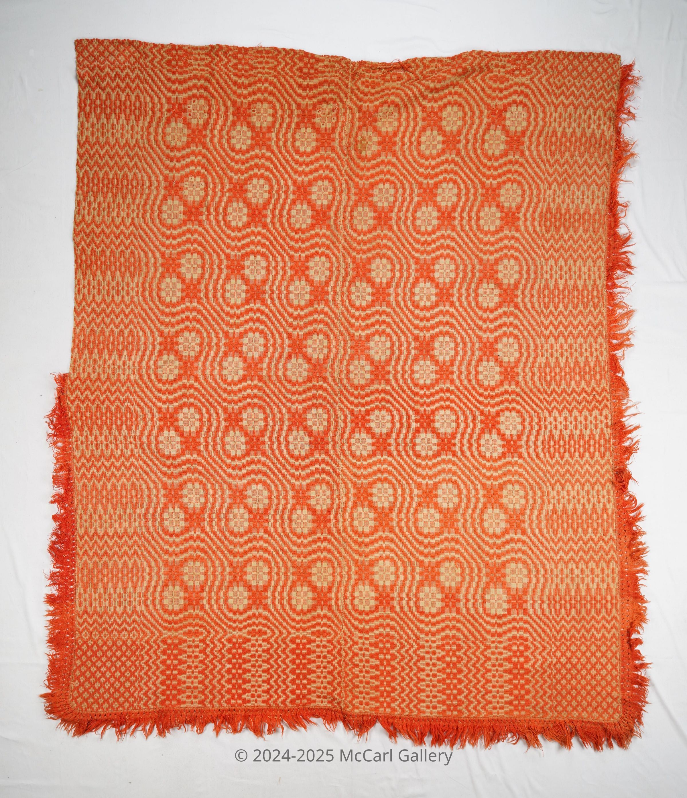 Natural and red geometric overshot coverlet; two panels joined by a center seam. Border on four sides; full fringe on two sides, runs out halfway up left side.Collection