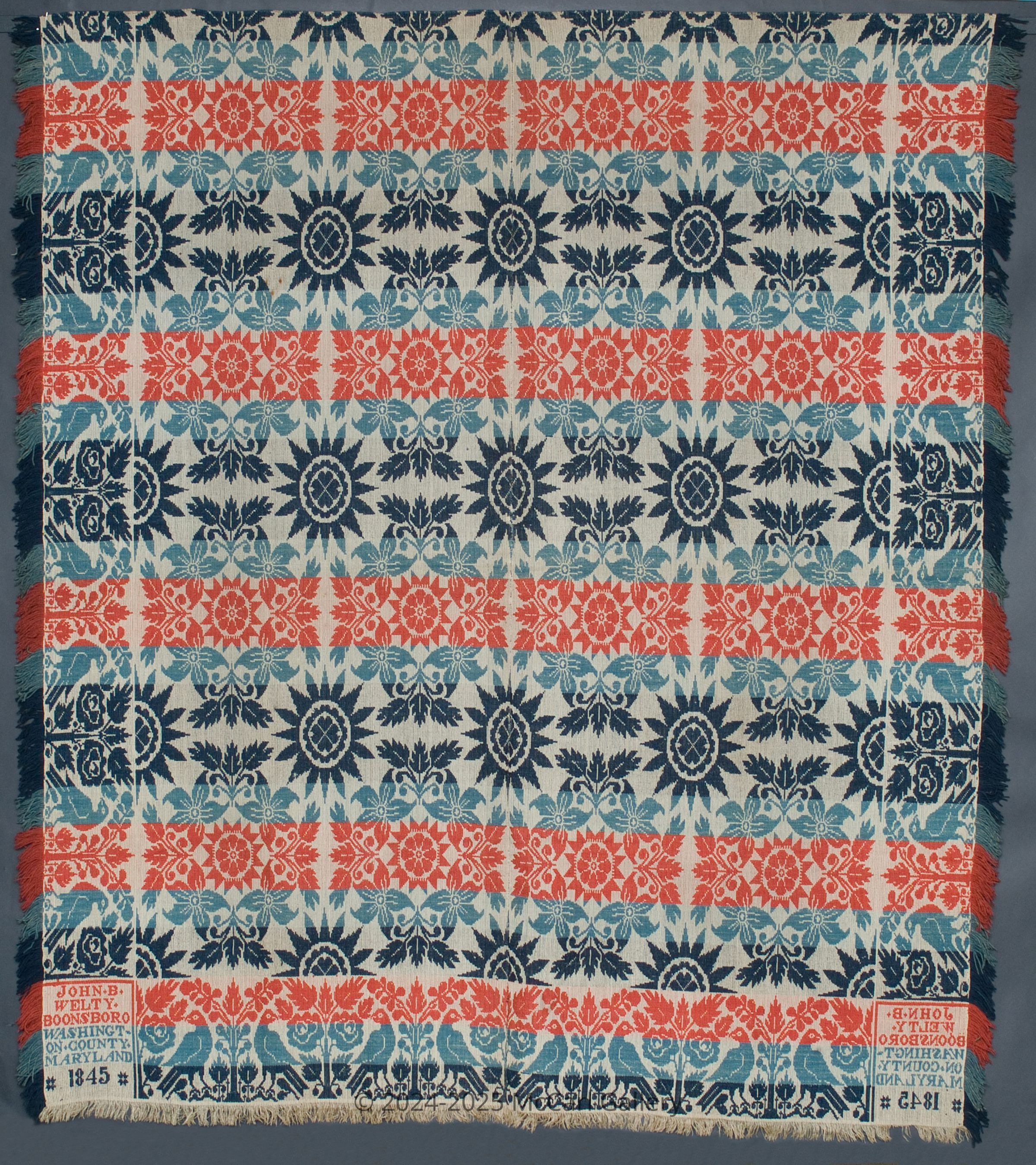 Beiderwand; red, natural, light blue, navy; fringe on 3 sides; 2 loom widths joined; border on 3 sides with distelfinks and rosette trees; 2 corner blocks with inscriptions; center floral clusters of star like flowersCollection