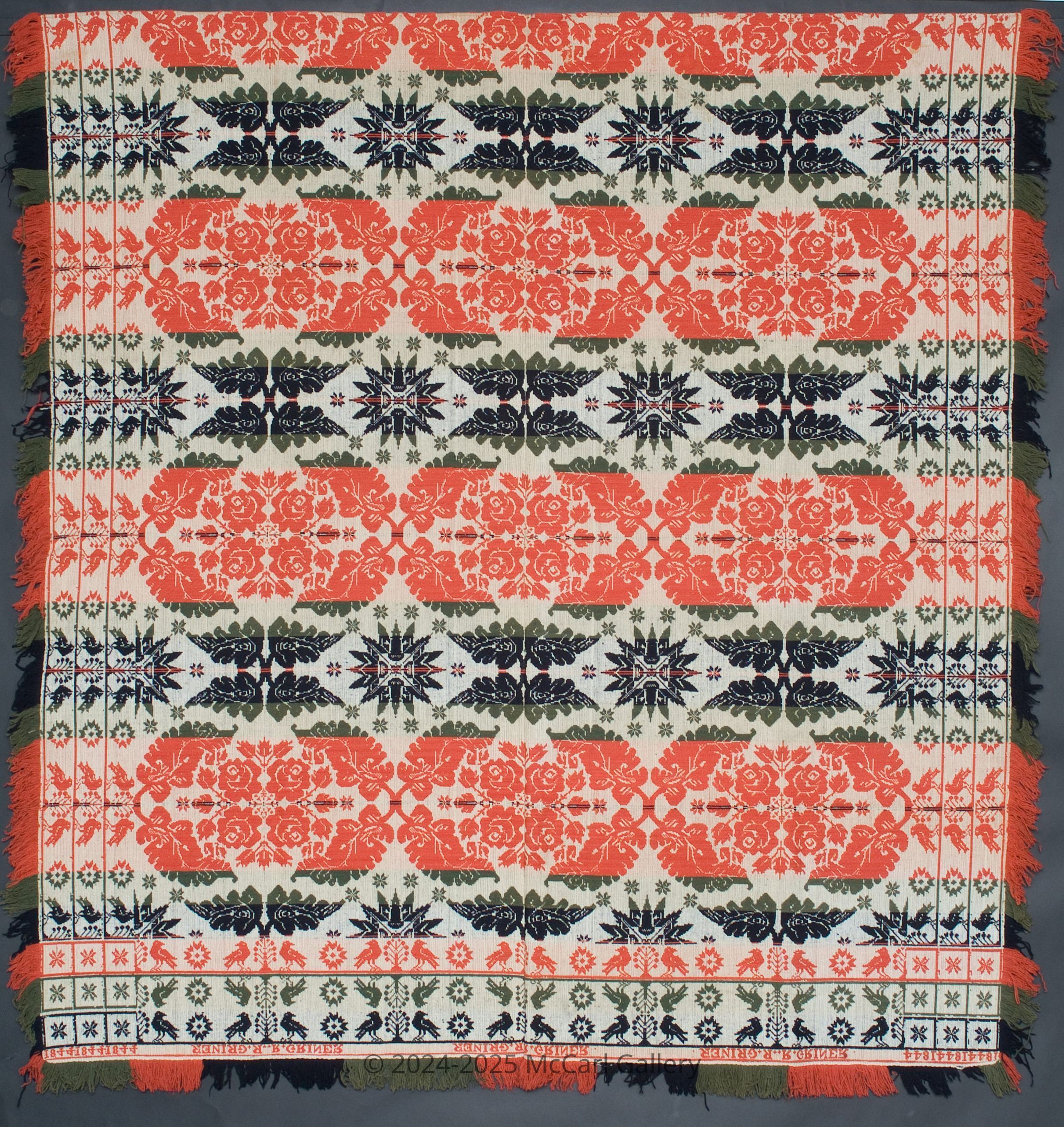 Beiderwand; pink, green, natural, navy; two loom widths joined; fringe and border on 3 sides; border of stars and distelfinks; corner blocks have windmill like flowers, bottom strip has inscription; centerfield has rosette clusters, stars, and feathers or leavesCollection