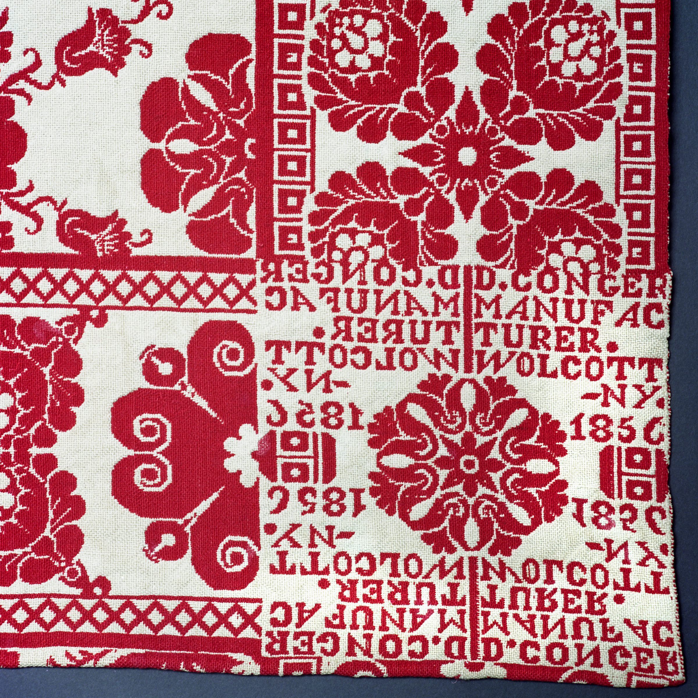 Double weave; red, natural; seamless; no fringe; two different borders, both of flowers; 4 corner blocks with inscriptions and flowers; centerfield of flowers surrounded by circles of flowersCollection